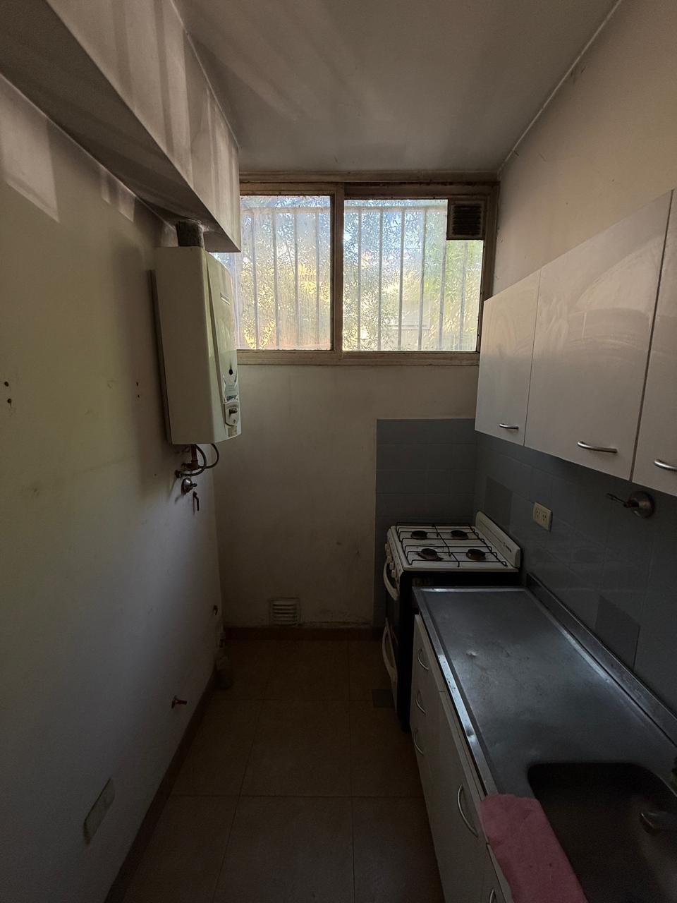 Cocina de forma rectangular, ventana al exterior, mesada de acero inoxidable. bacha, muebles alto y bajo mesada. Cocina a gas de cuatro hornallas y horno. Calefón a gas marca Orbis. Se puede adaptar instalación para lavarropas. Paredes con revestimiento simil mármol.