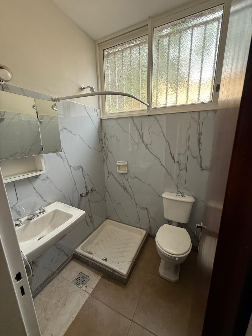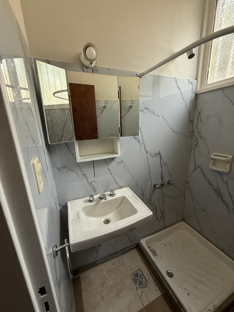 Baño con bacha, botiquin espejado, inodoro con mochila nuevo, espacio ducha con receptáculo nuevo. Revestimientos con placas simil mármol.