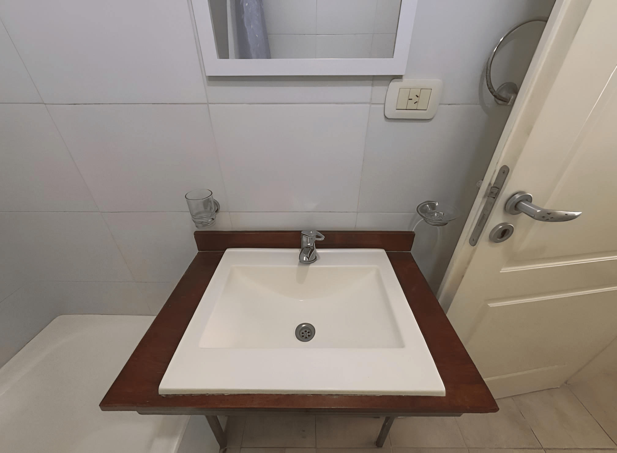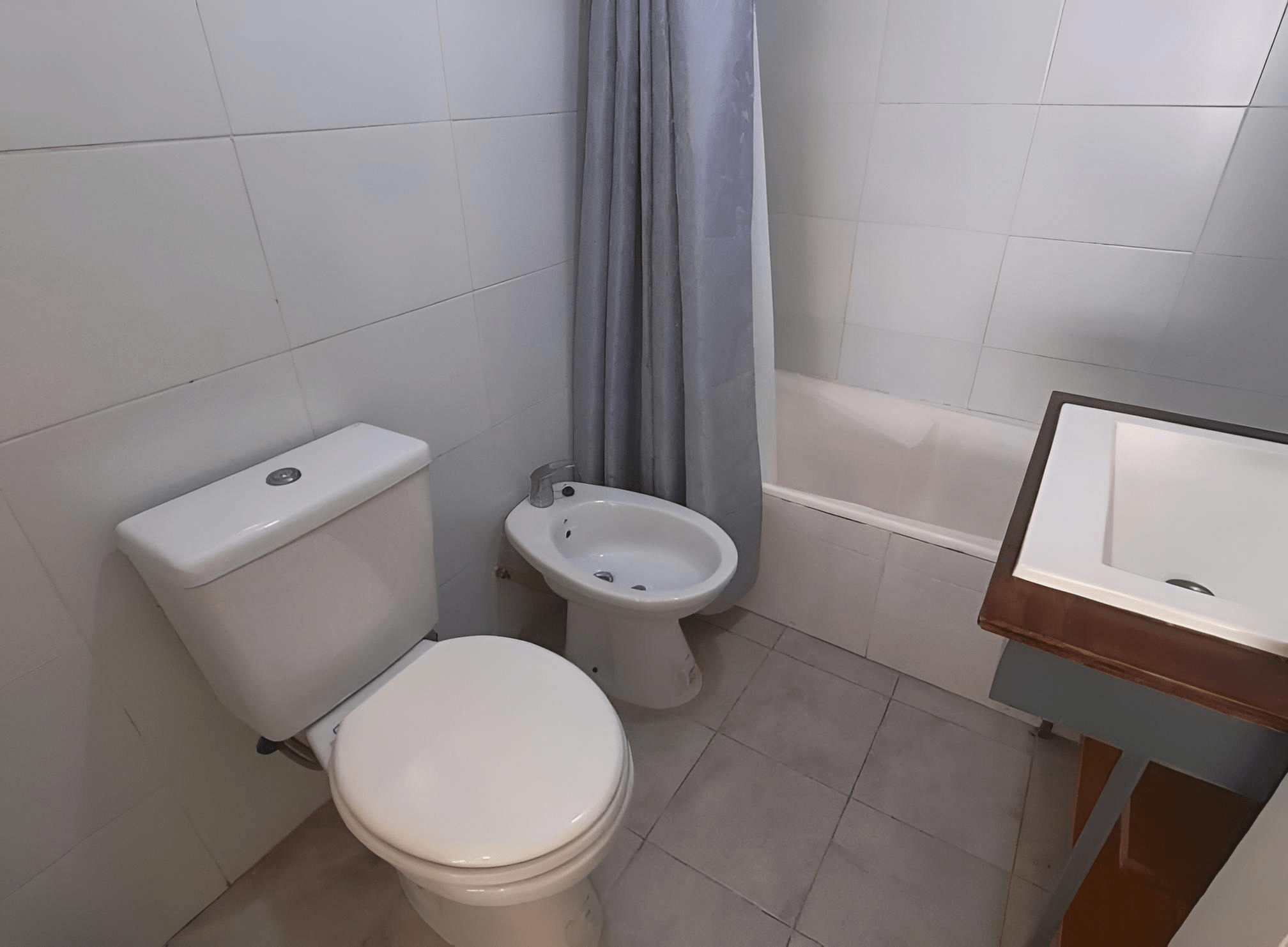 Completo con bacha, vanitory, espejo, toallero, bañera y sanitarios.