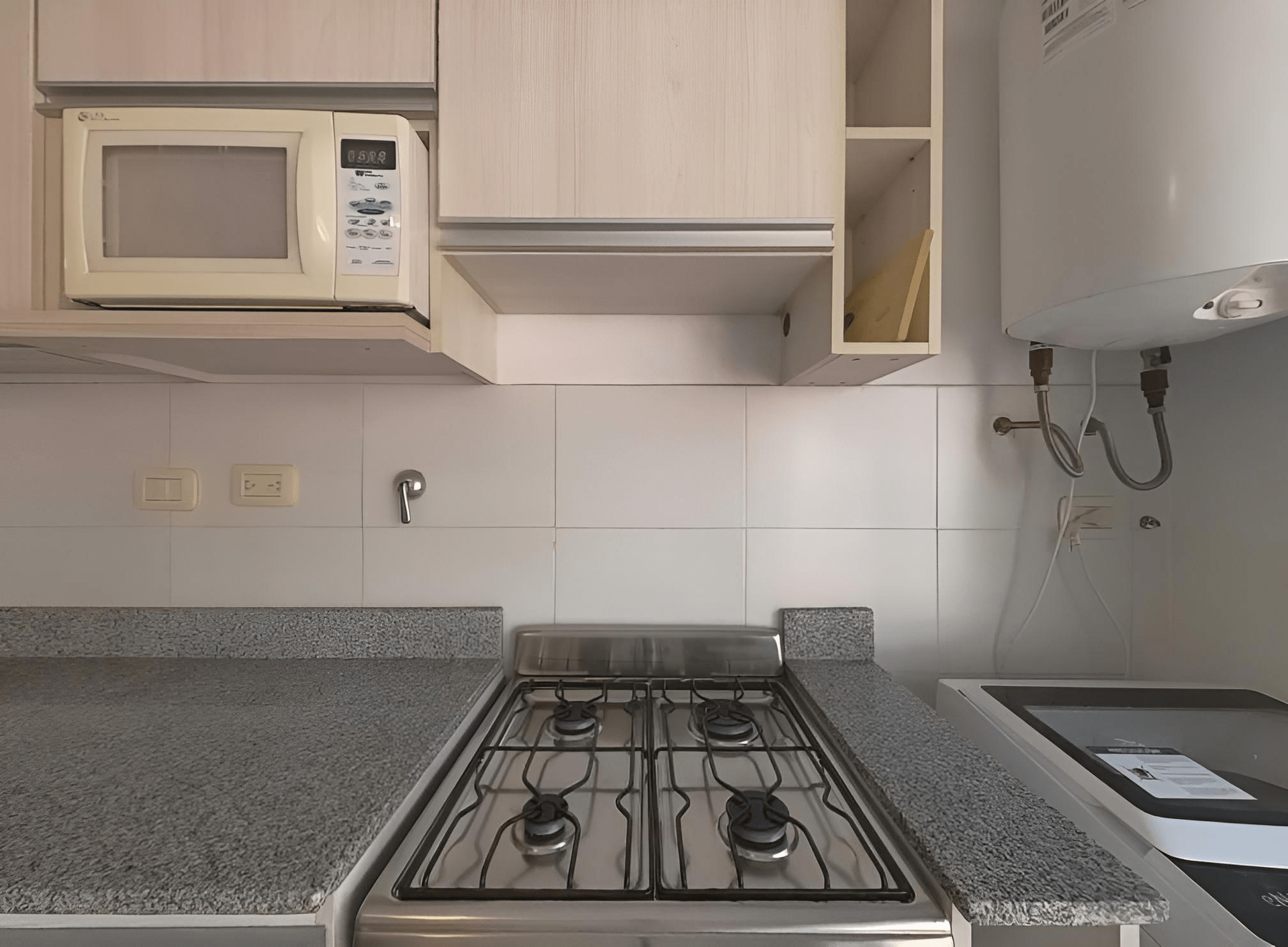 Incorporada al ambiente principal, cocina a gas de cuatro hornallas, termotanque, lavarropas, muebles alto y bajo mesada, equipamiento de cocina. Microondas.