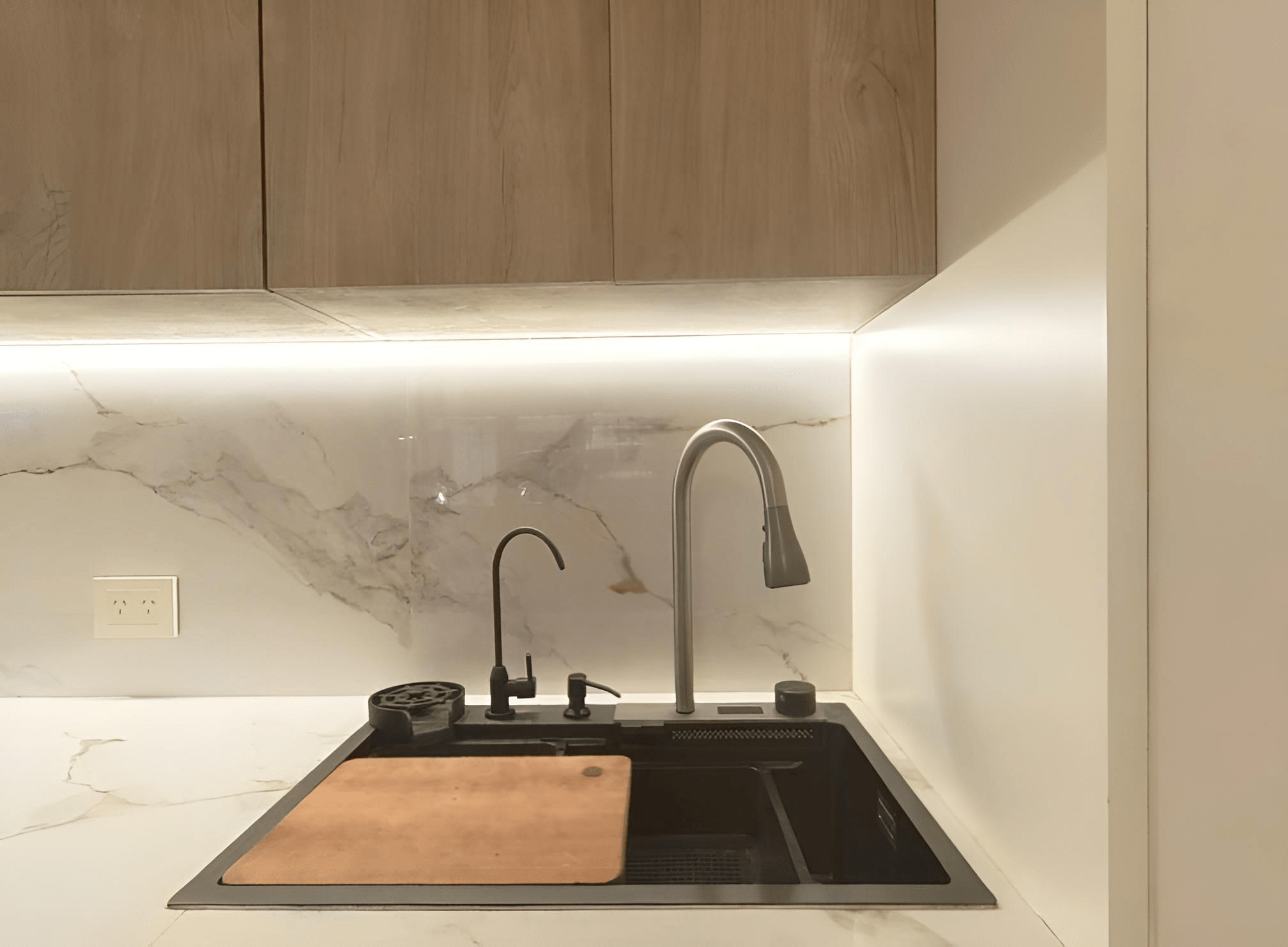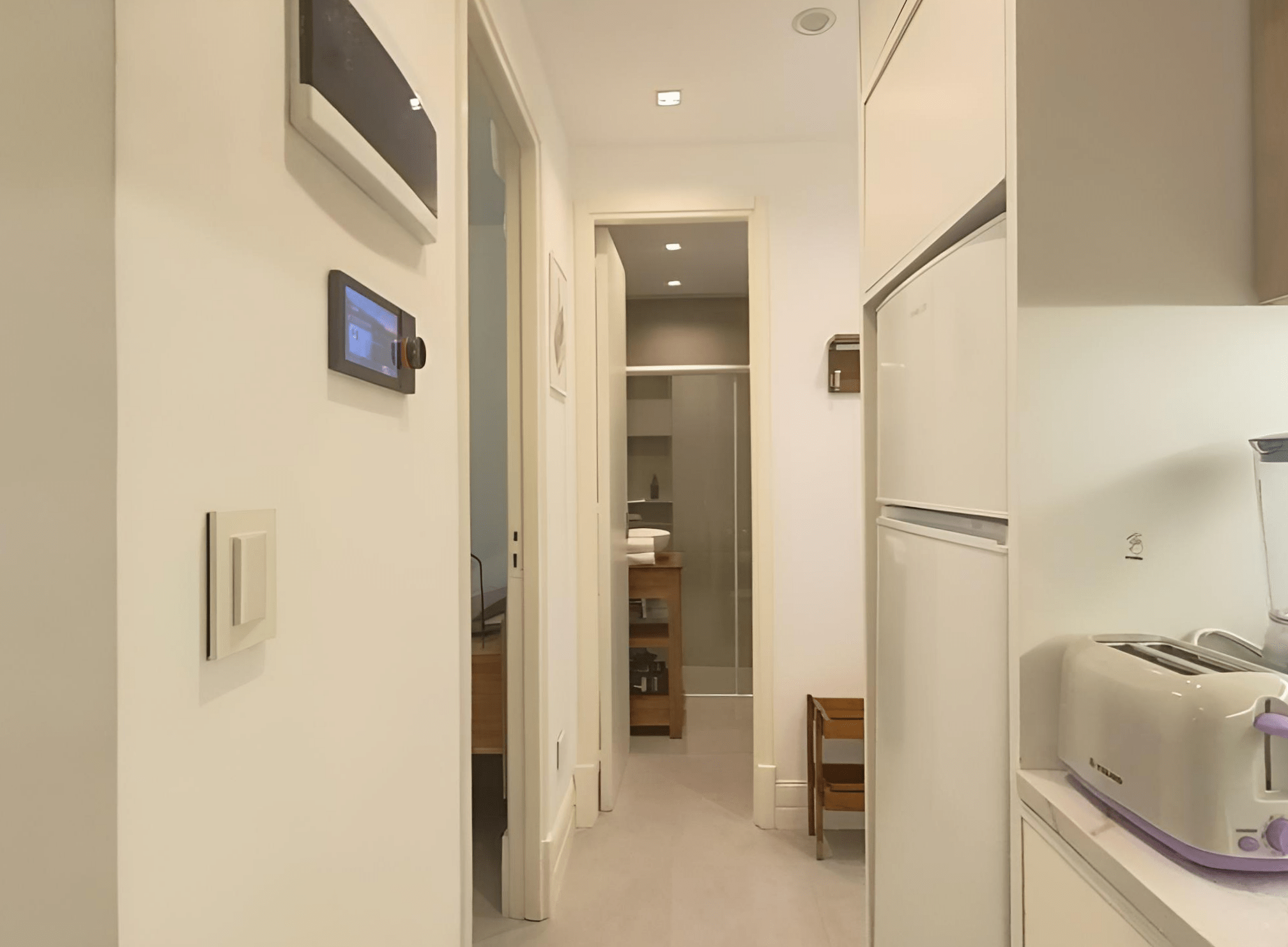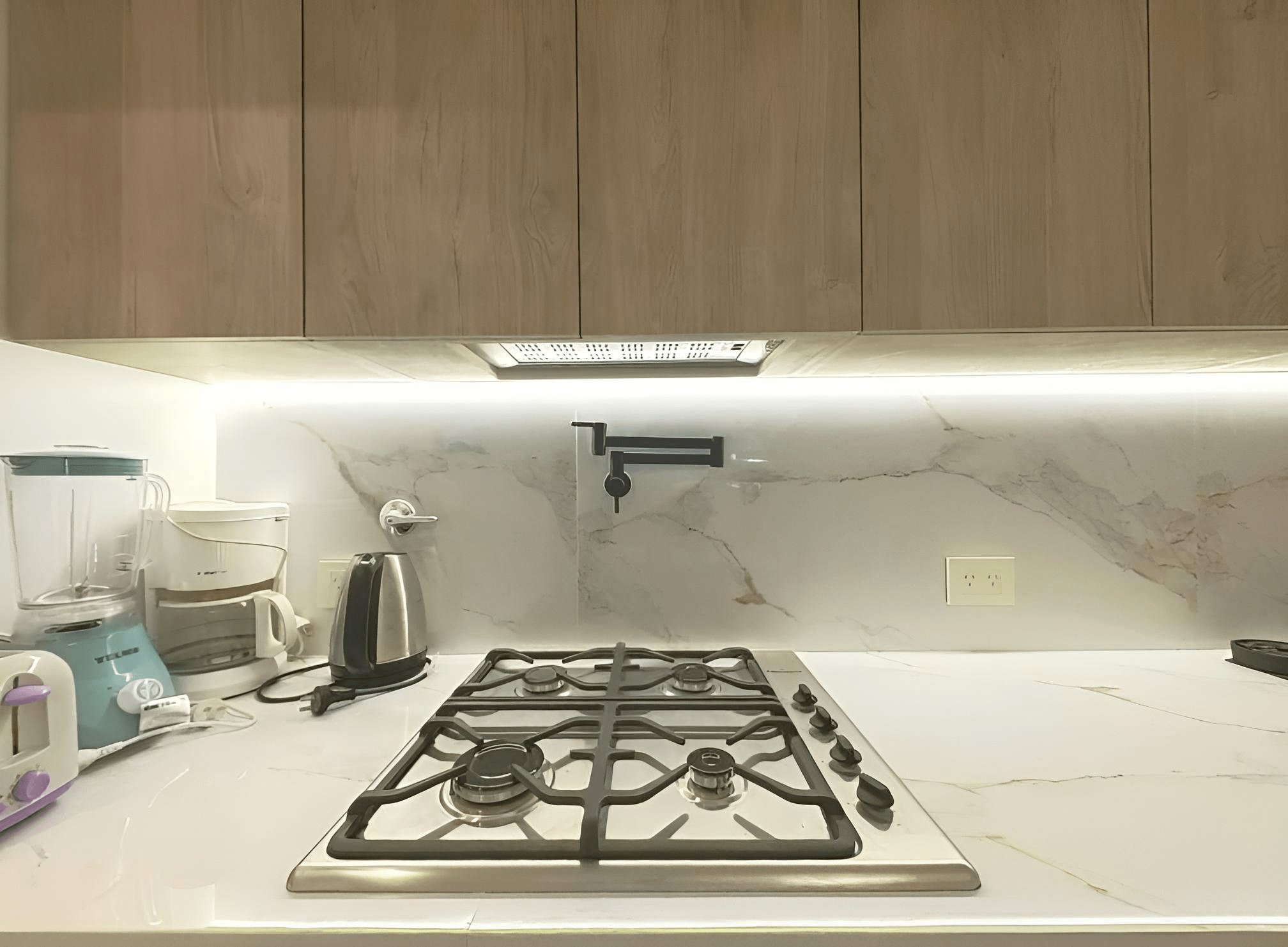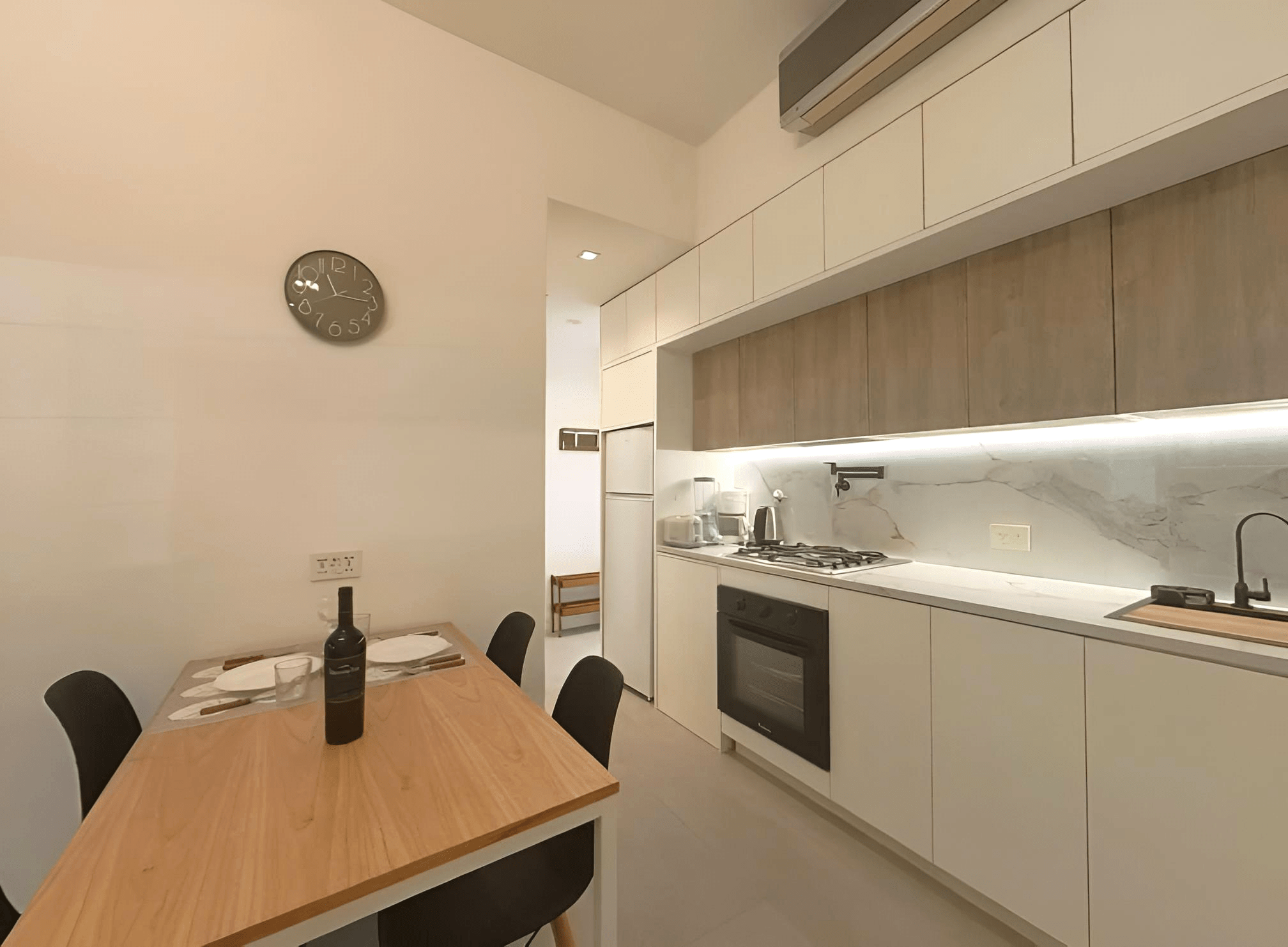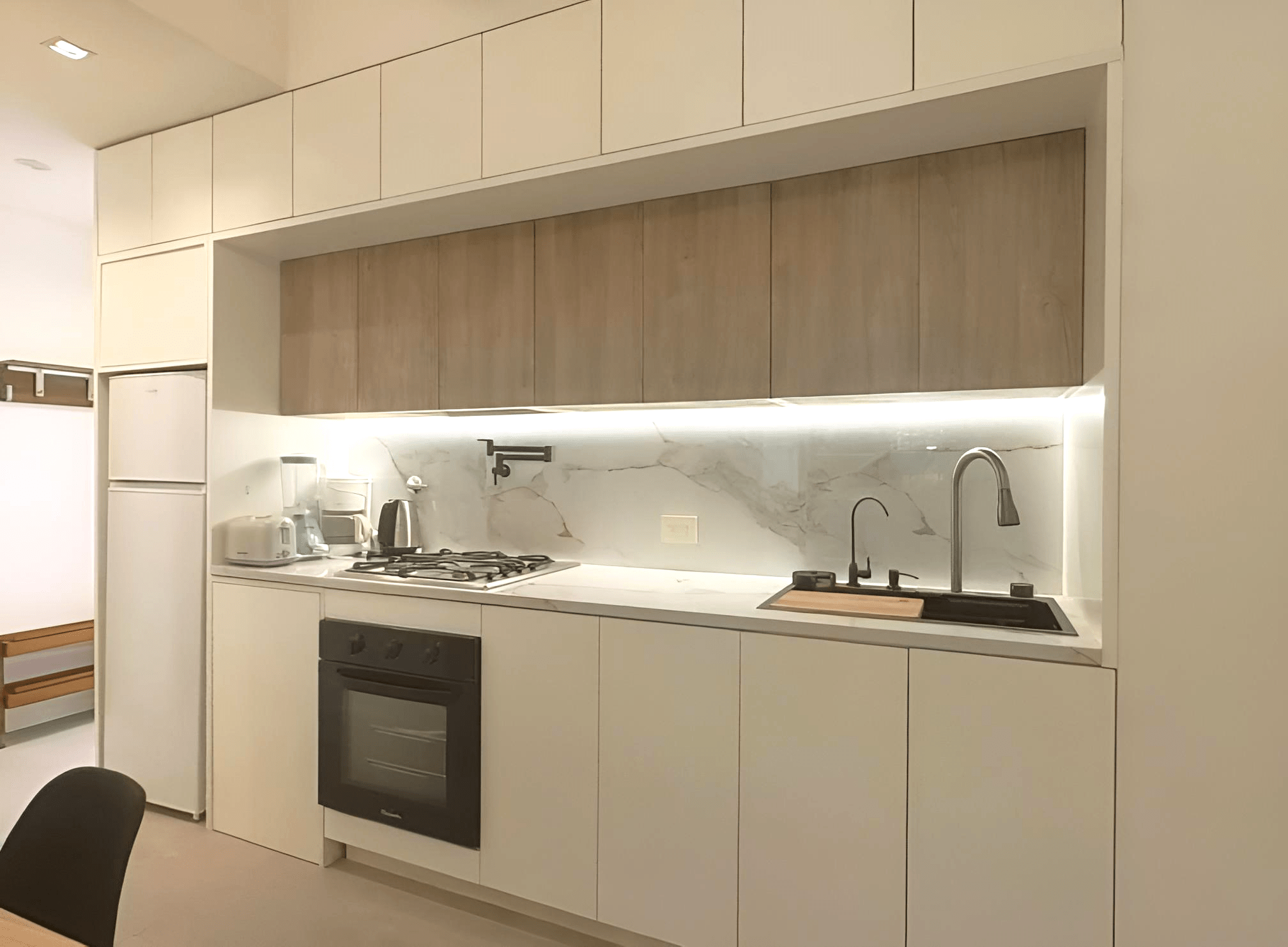 Cocina incorporada de estilo moderno con detalles de confort y categoría. Mesada de marmol, doble bacha con griferia extensible, mueble alto y bajo mesada con diseño exclusivo, cocina de cocinar a gas de cuatro hornallas y horno, grifería especial adicional para cocinar, heladera con freezer, vajilla completa. Microondas. Pava cafetera y tostadora eléctrica.