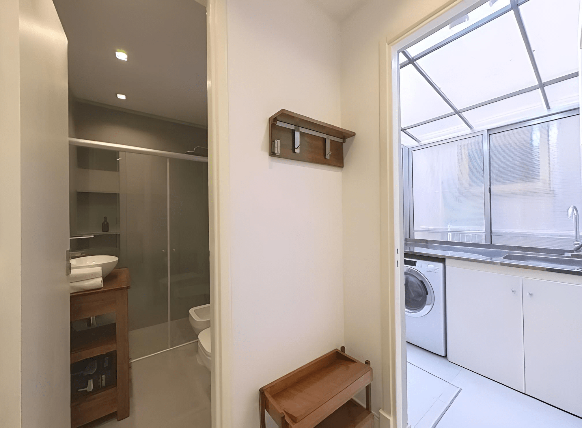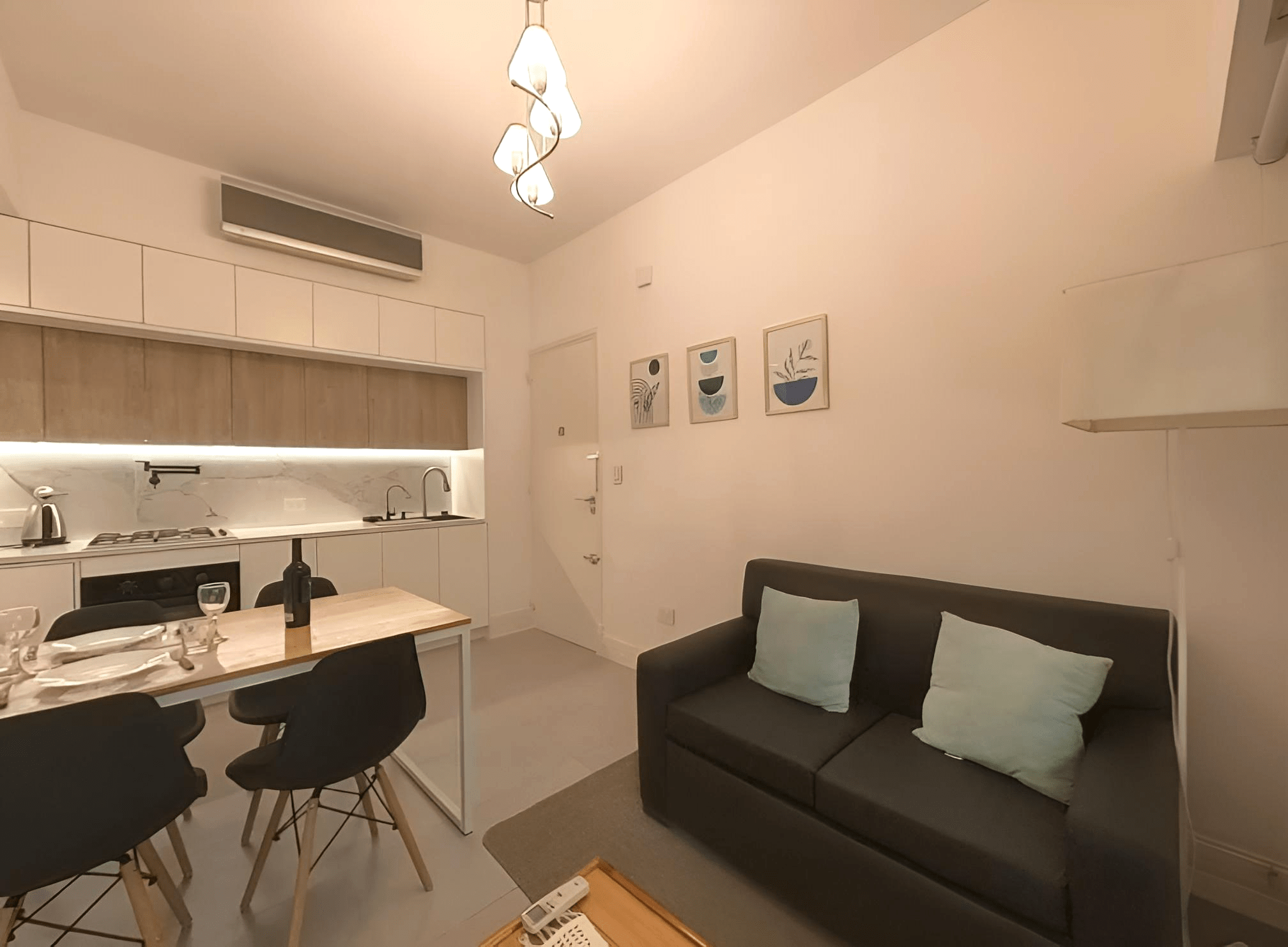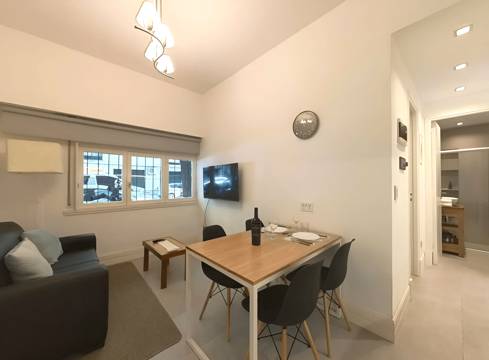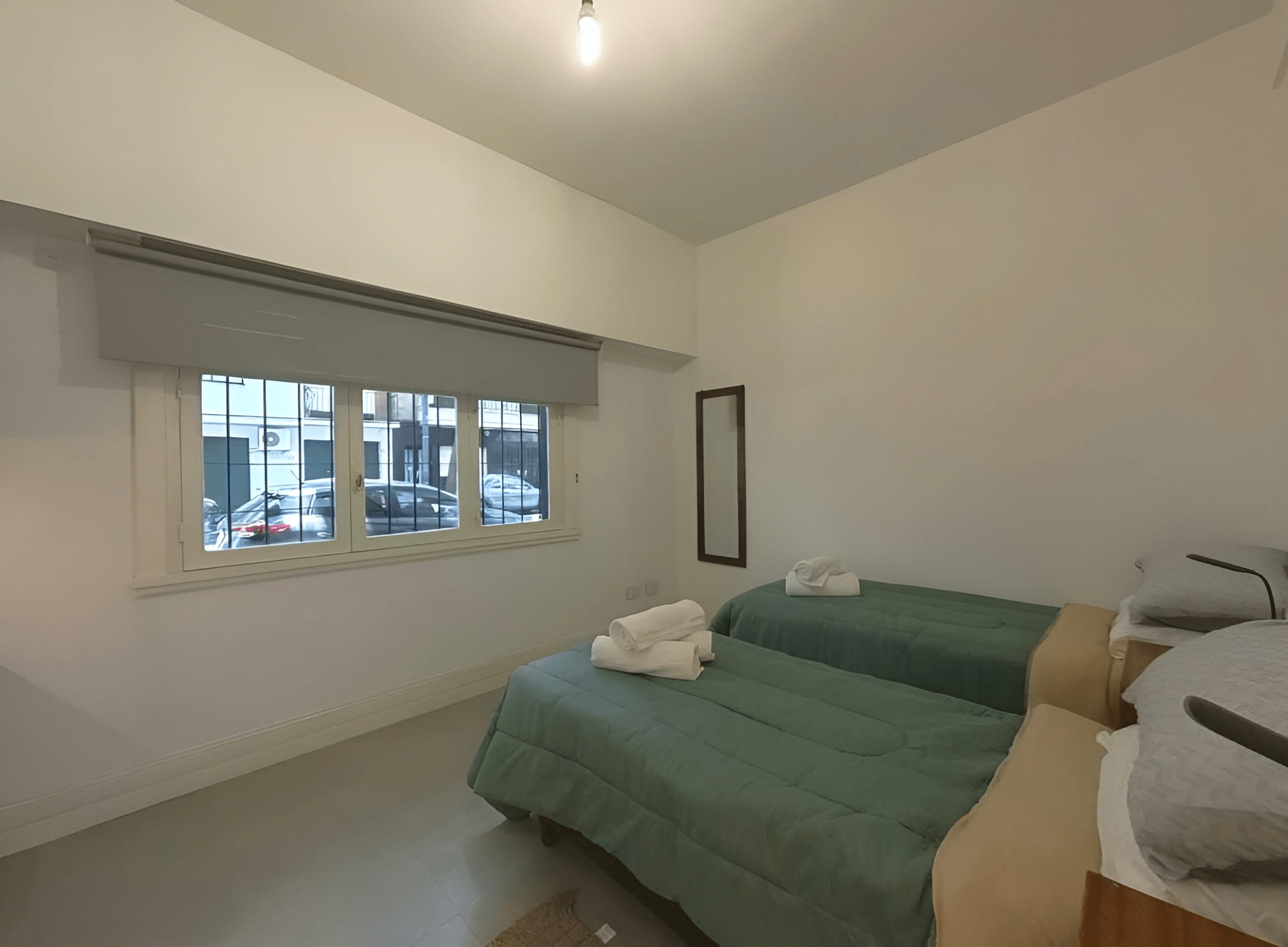 El departamento se encuentra en excelente estado, recién de pintado, pisos de porcelanto, las ventanas y sus marcos son antigüas de madera pintada de blanco, con sus respectivos herrajes persianas de enrollar y rejas. Techos altos. El living comedor tiene mesa, sillas, sofa/ cama, Tv, aire acondicionado frío/calor. La cocina de diseño incorporada al ambiente principal. Desde el living comedor por un hall se accede al dormitorio, al baño y al lavadero. El dormitorio tiene excelentes dimensiones, dos camas sommier individuales que se pueden transformar en cama matrimonial. Amplio placard especialmente diseñado con puertas corredizas, cajonera, espacio de guardado y escritorio, mesas de noche, luminaria. Ropa blanca. Posee amplio ventanal con vista a la calle. Aire acondicionado Frio/ calor. Lavadero techado con lavasecarropas, pileta de acero inoxidable, mueble de guardado. Pequeño patio con sillas. Multimedia con música funcional centralizada. Medidas y fotos 360 orientativas.