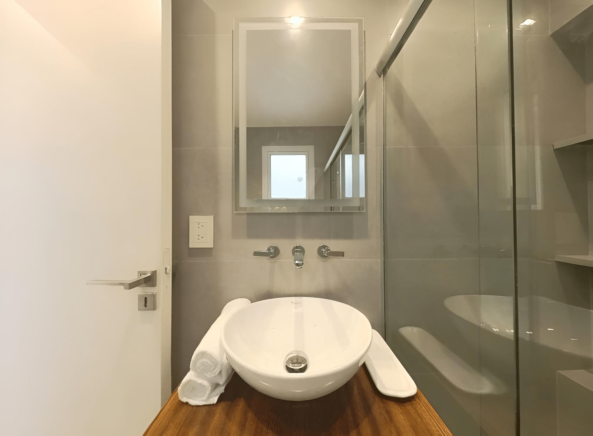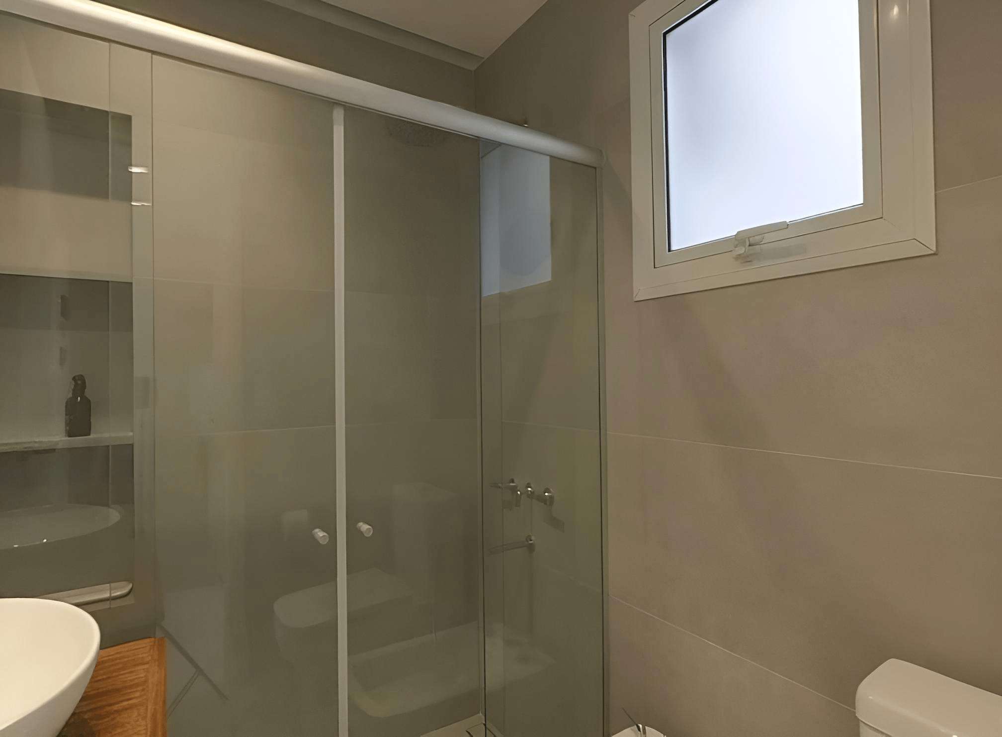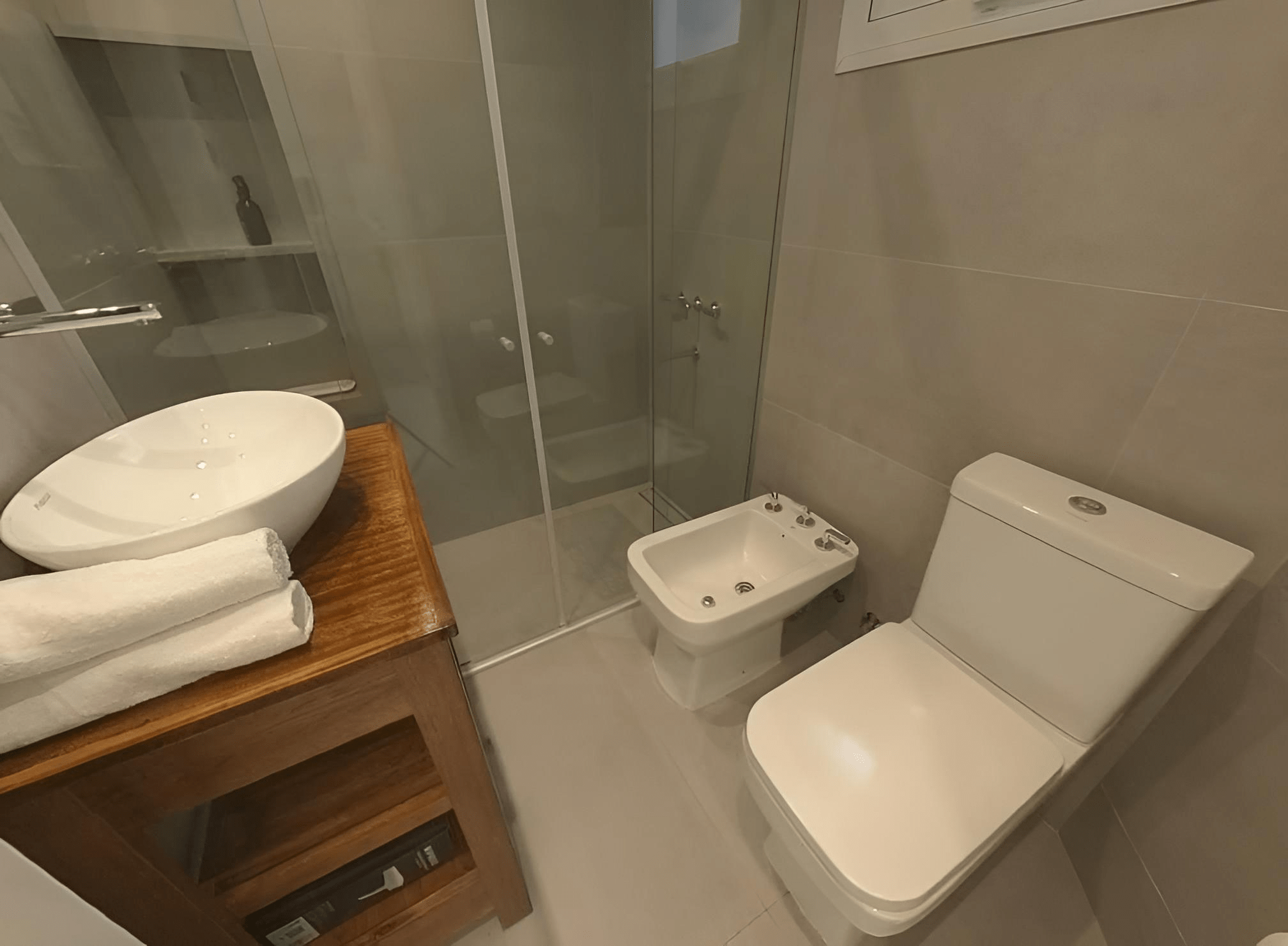 Baño completo con vanitory de madera, espejo, sanitarios blancos, inodoro con mochila, bidet, ducha con receptáculo rectangular, mampara, ventana de aluminio. Revestimientos de porcelanto.