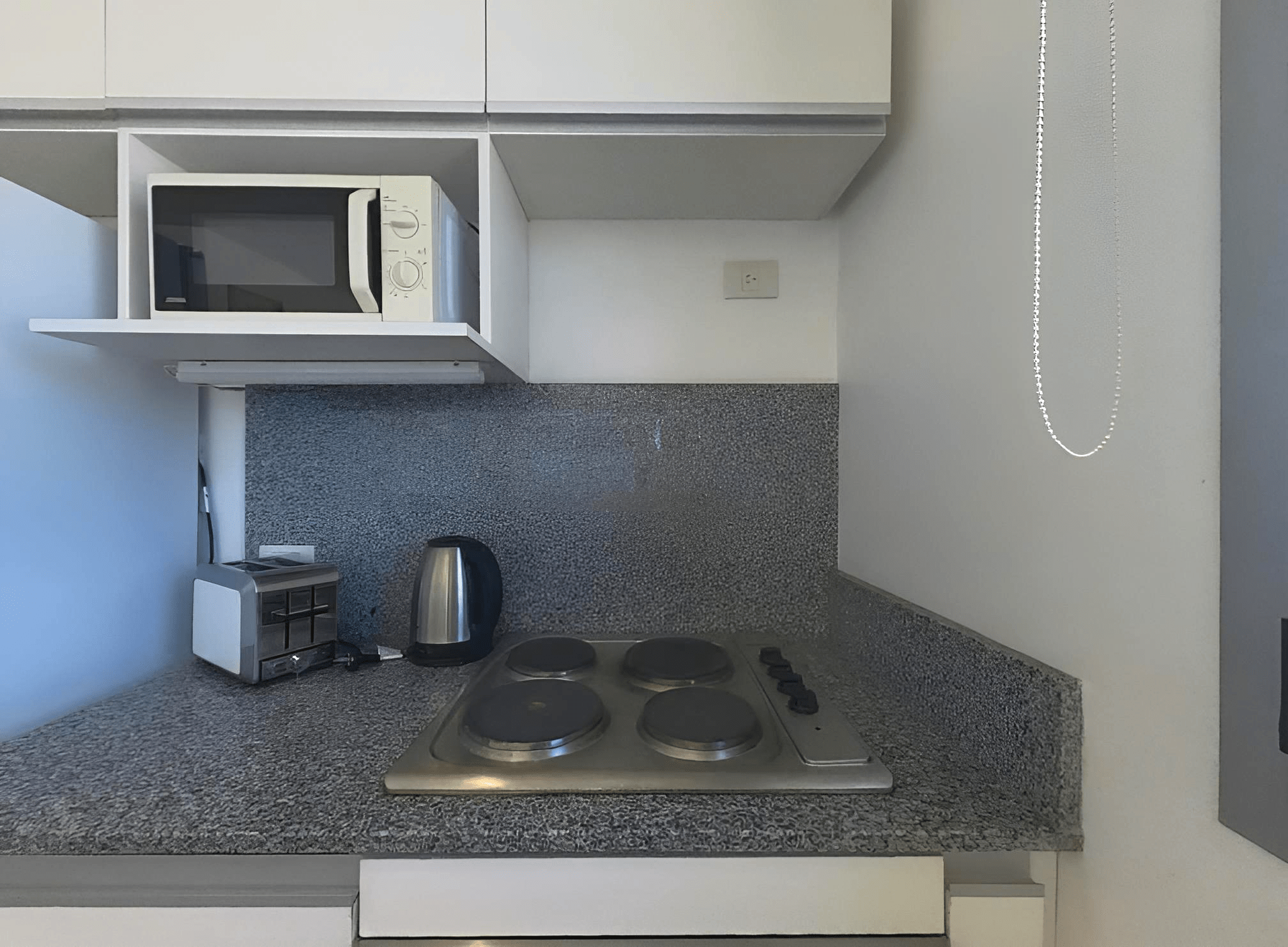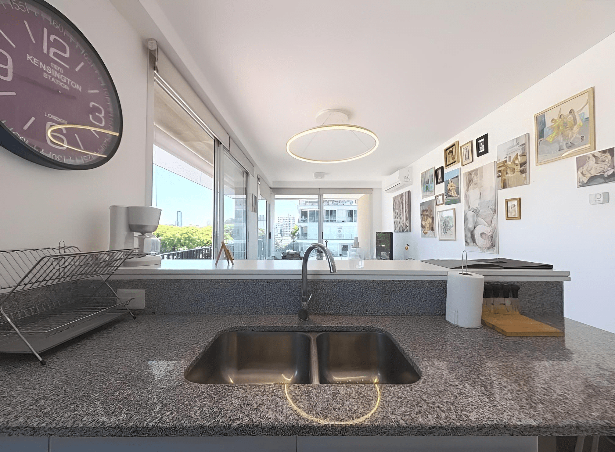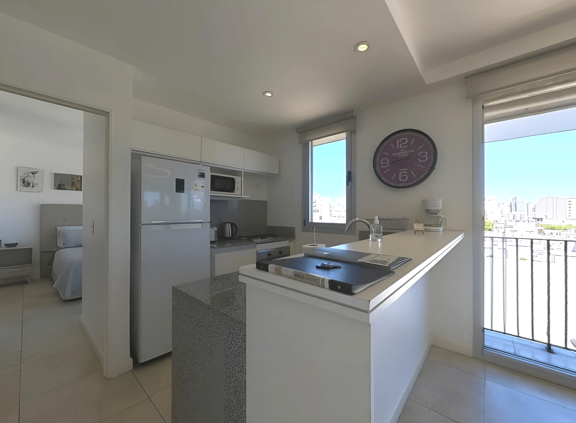 Completa de diseño, integrada al living comedor, anfe y horno eléctrico. Muebles alto y bajo mesada, doble bacha, heladera con freezer. Microondas. Espacio breakfast. Amplio ventanal. Vajilla completa, Pava y cafetera eléctrica. Tostadora.
