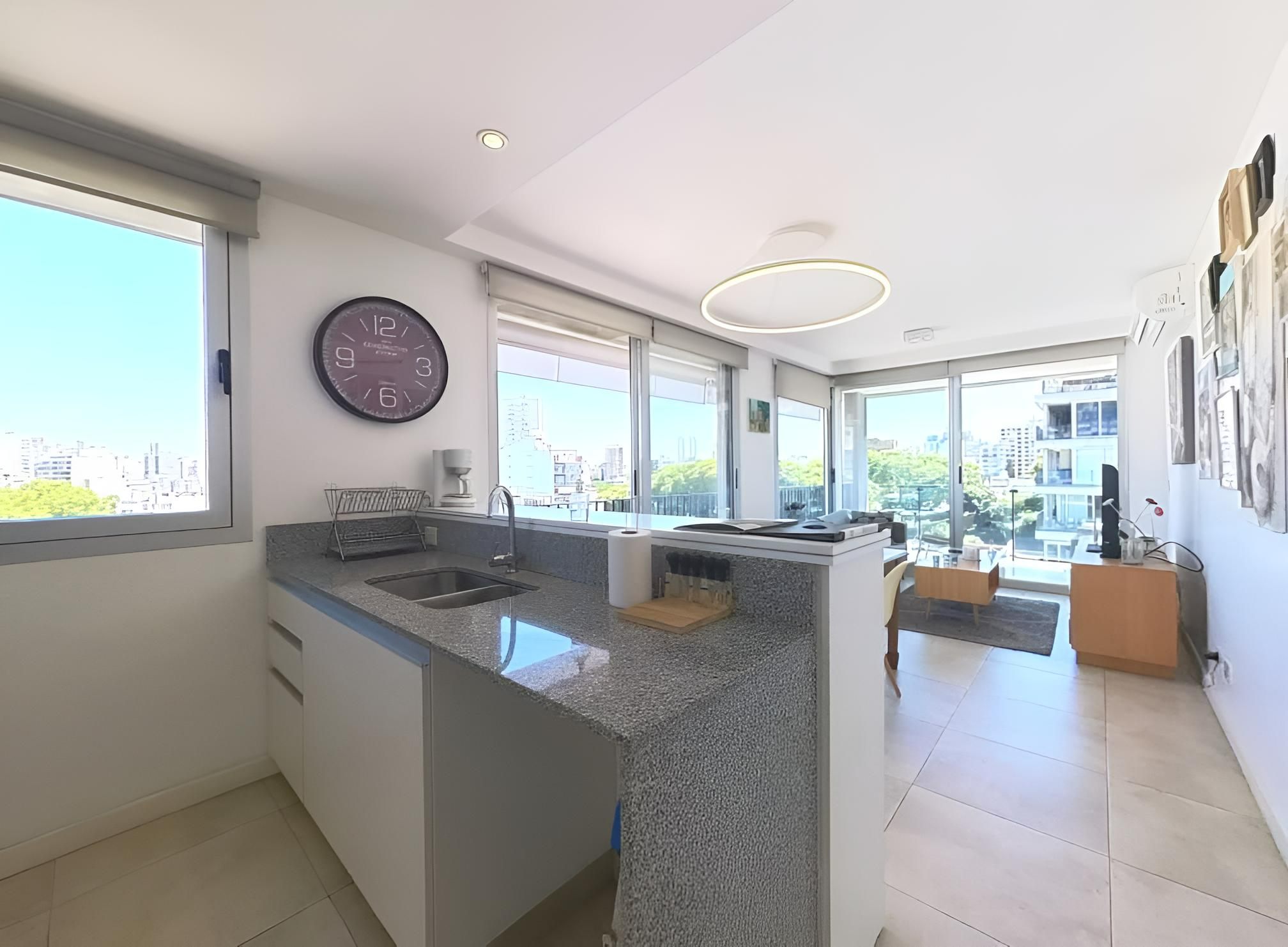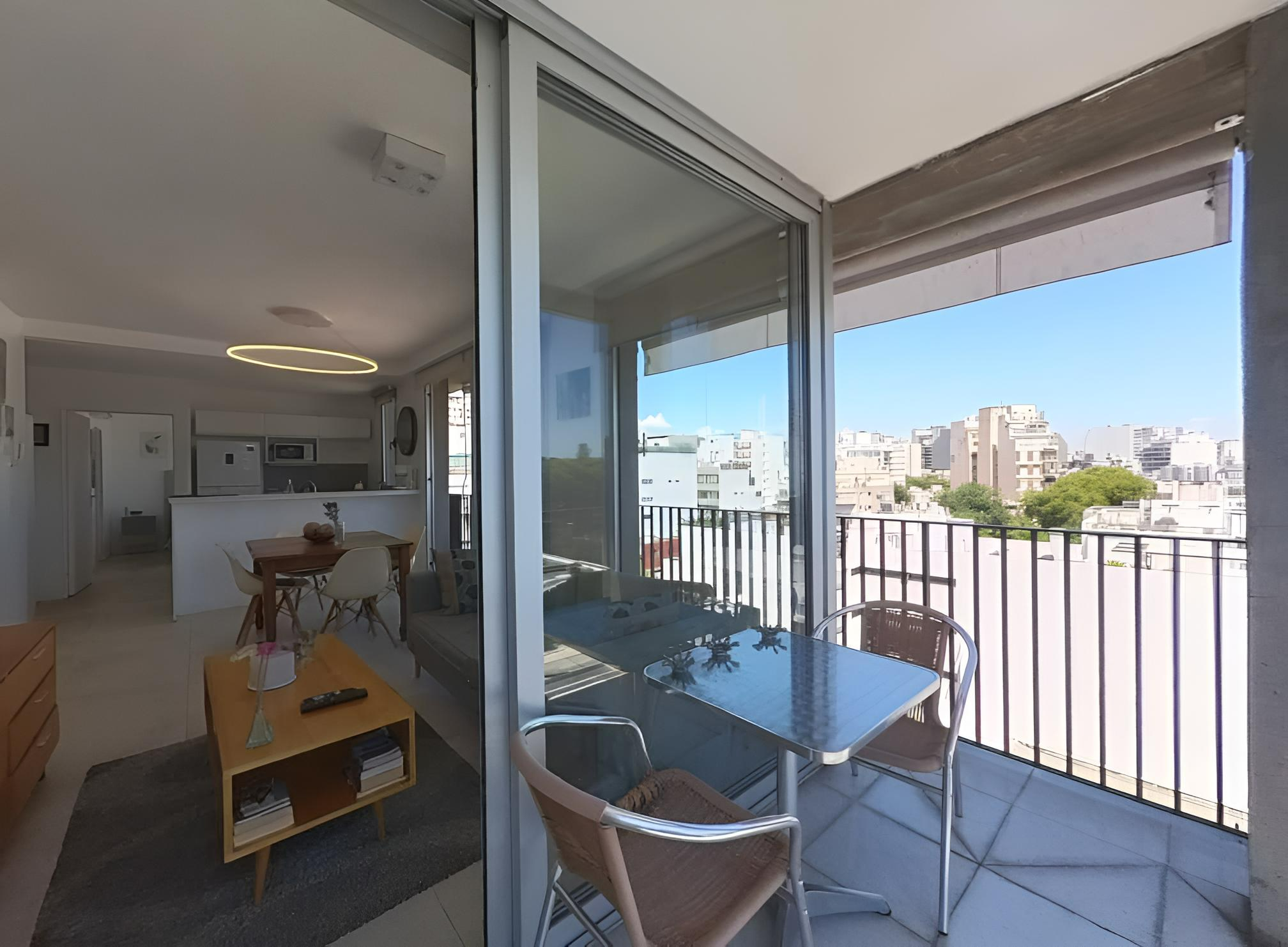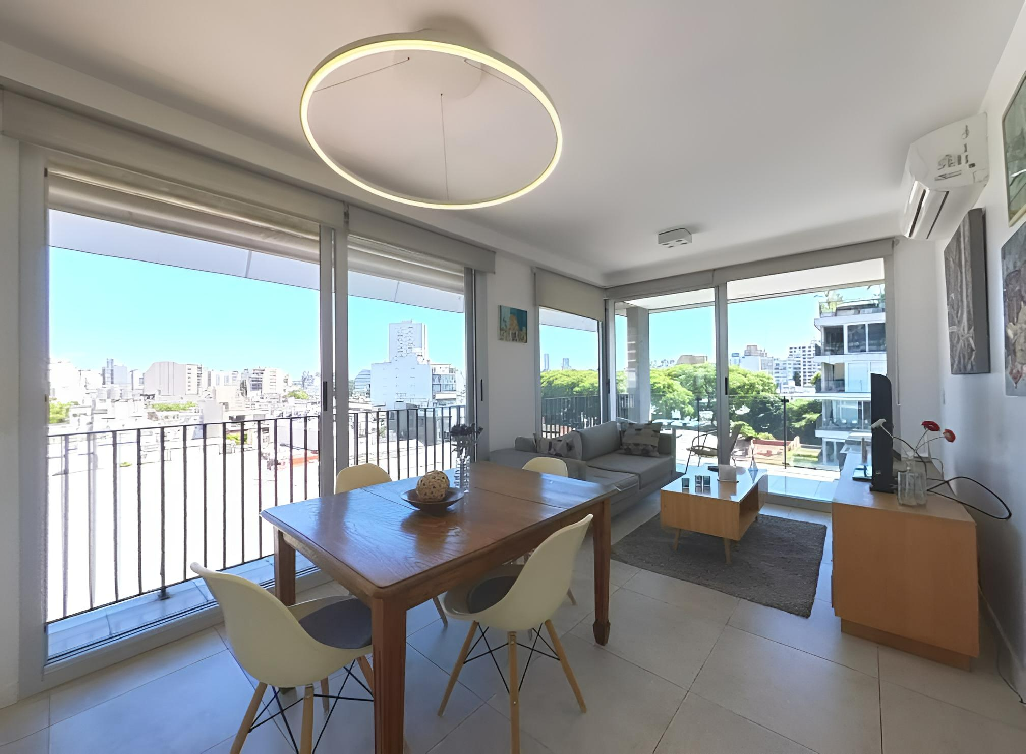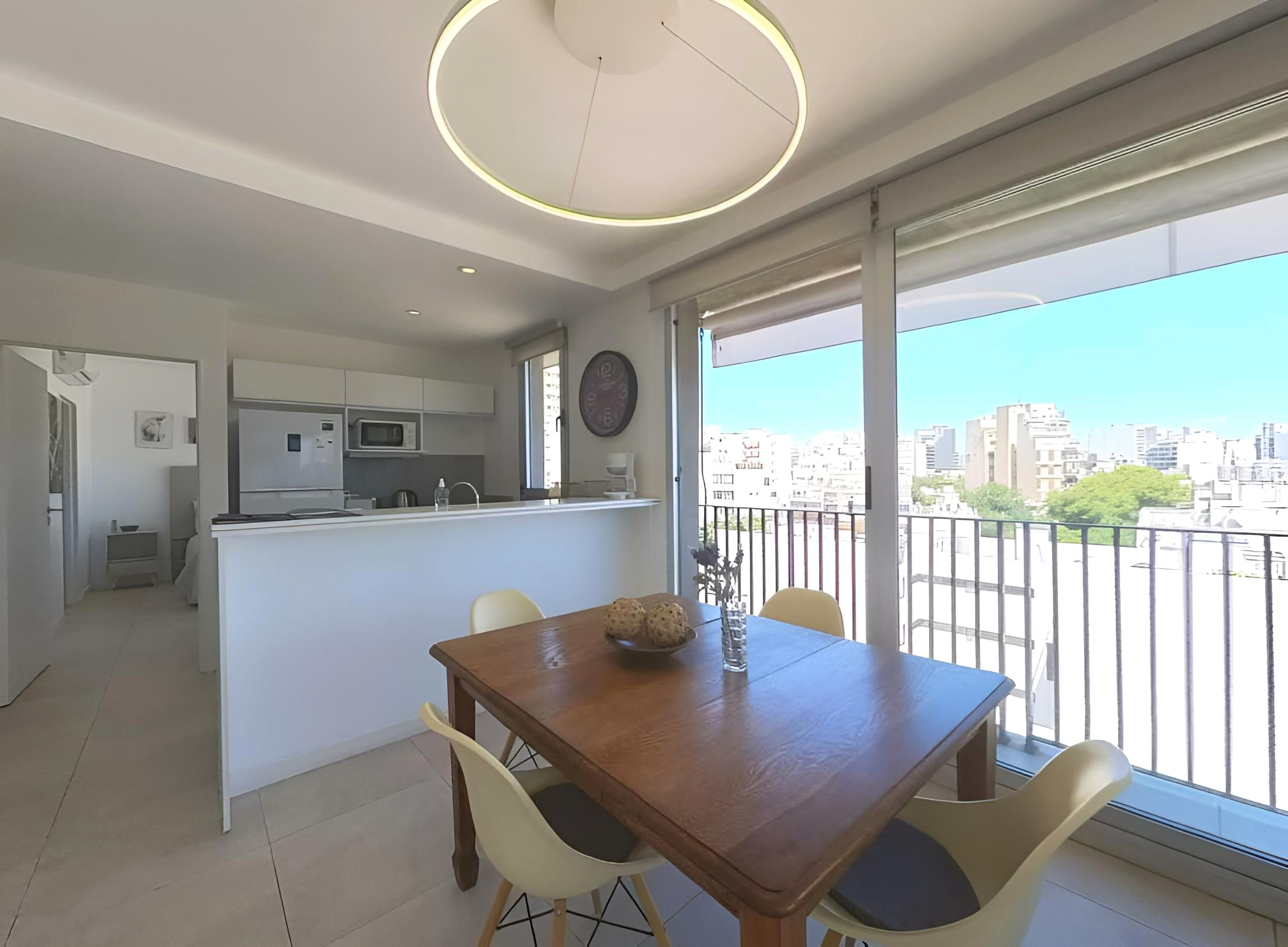 Amplio living comedor con grandes ventanales, mesa, sillas, sillón, TV Smart, mesa de apoyo. Dormitorio en suite con cama Queen, placard de diseño con espacio para guardado de ropa y valijas. Luminaria. Pisos de porcelnato. Pintura en excelente estado. Cortinas black out /sun screen