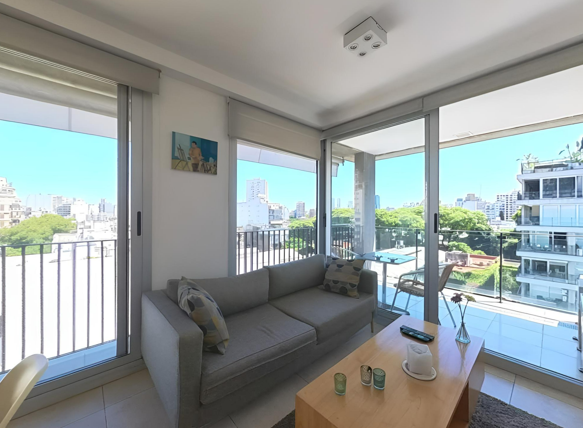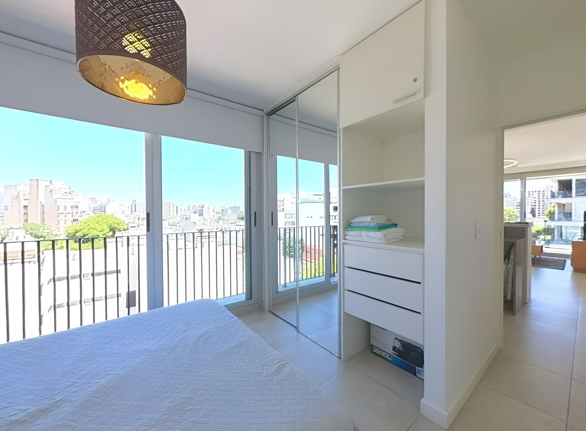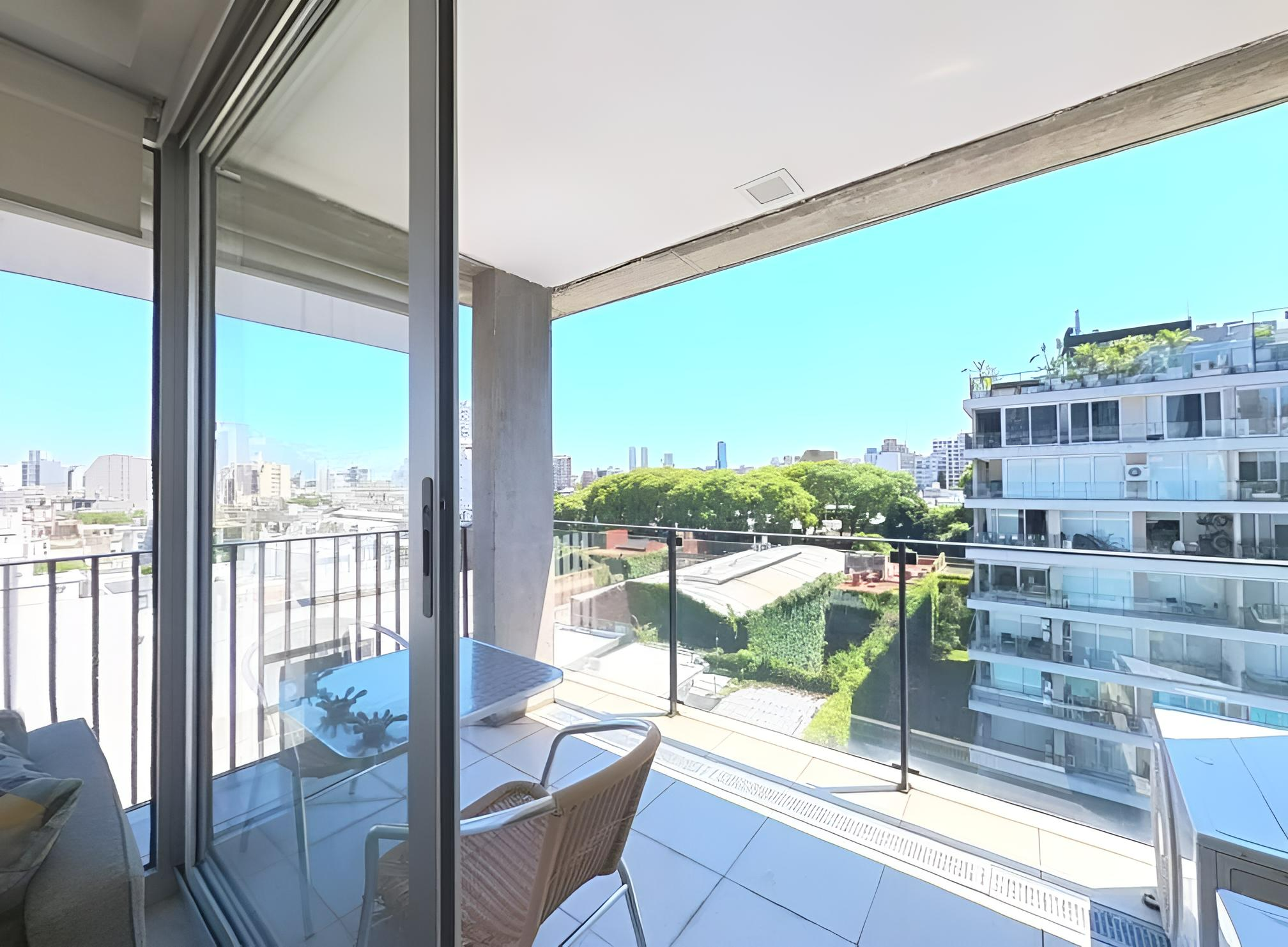 Amplio living comedor con grandes ventanales, mesa, sillas, sillón, TV Smart, mesa de apoyo. Dormitorio en suite con cama Queen, placard de diseño con espacio para guardado de ropa y valijas. Luminaria. Pisos de porcelnato. Pintura en excelente estado. Cortinas black out /sun screen