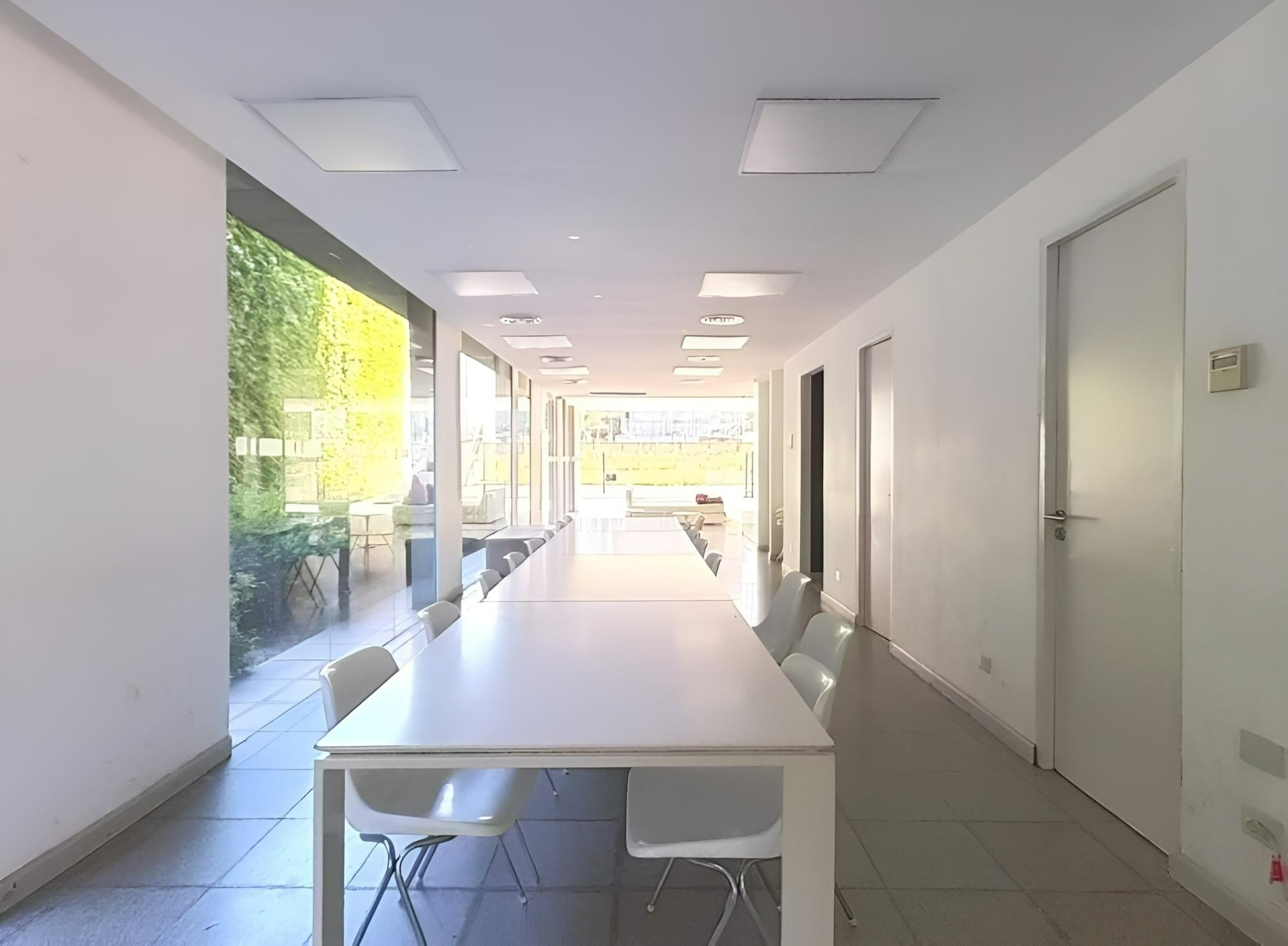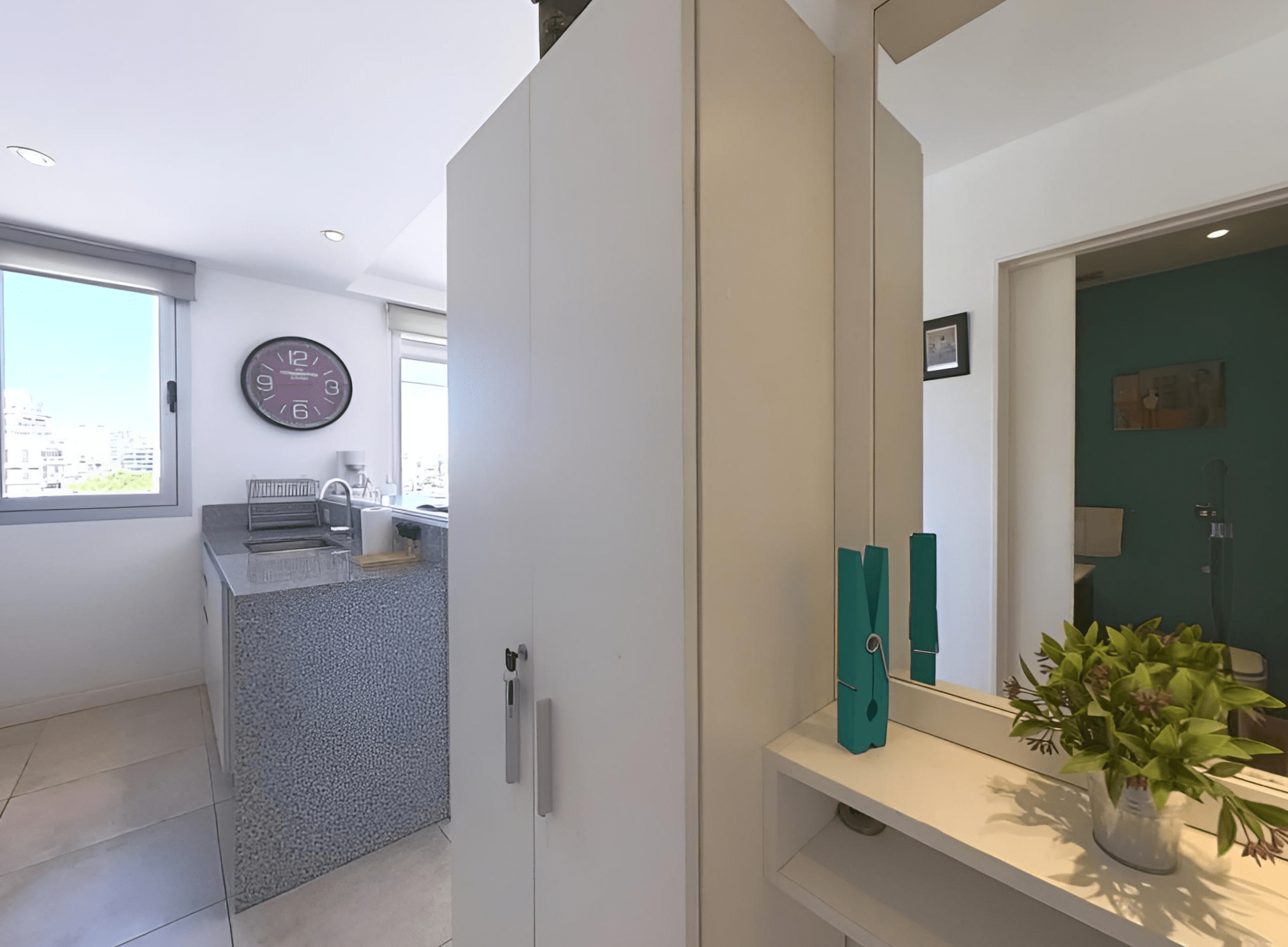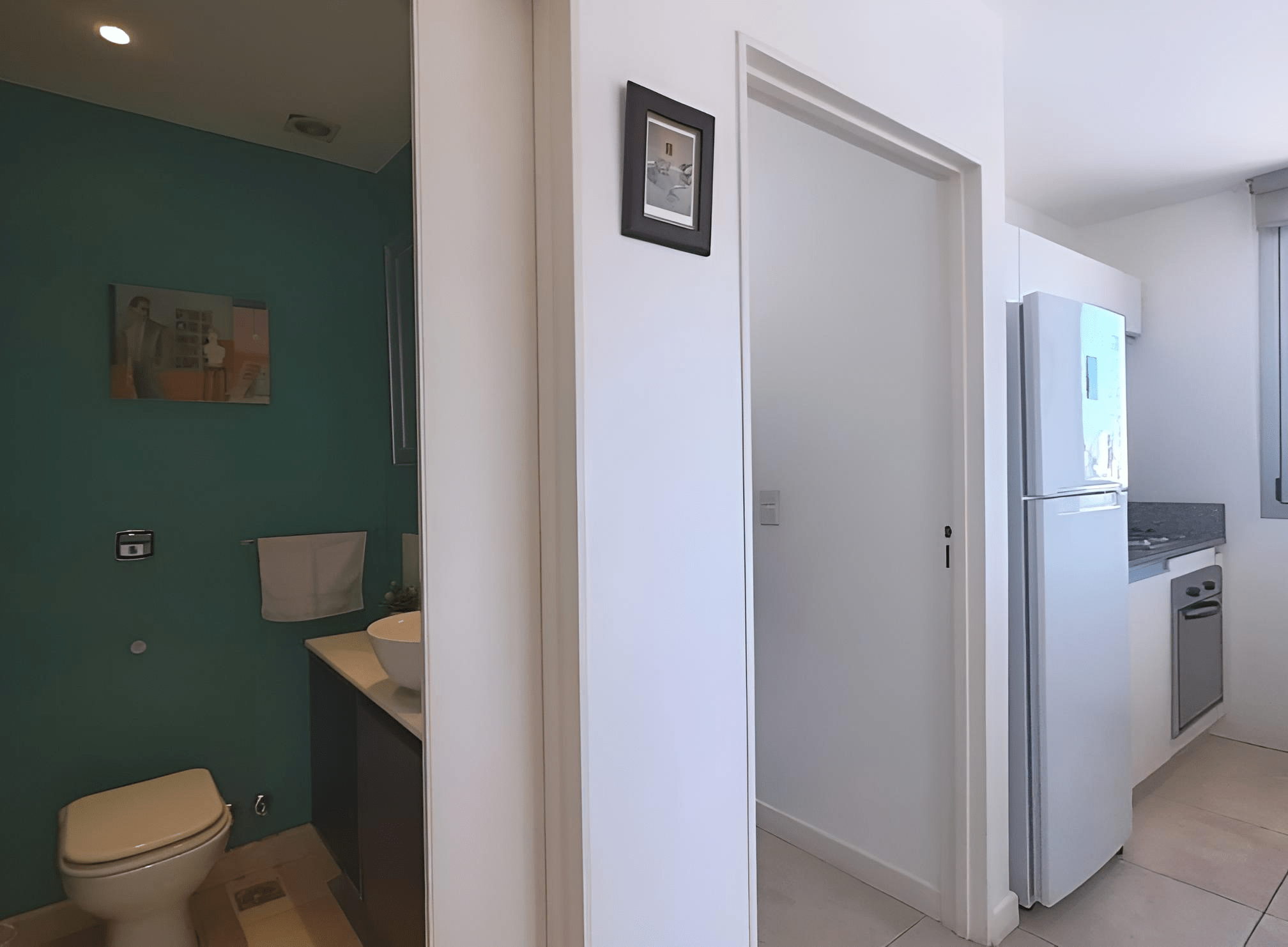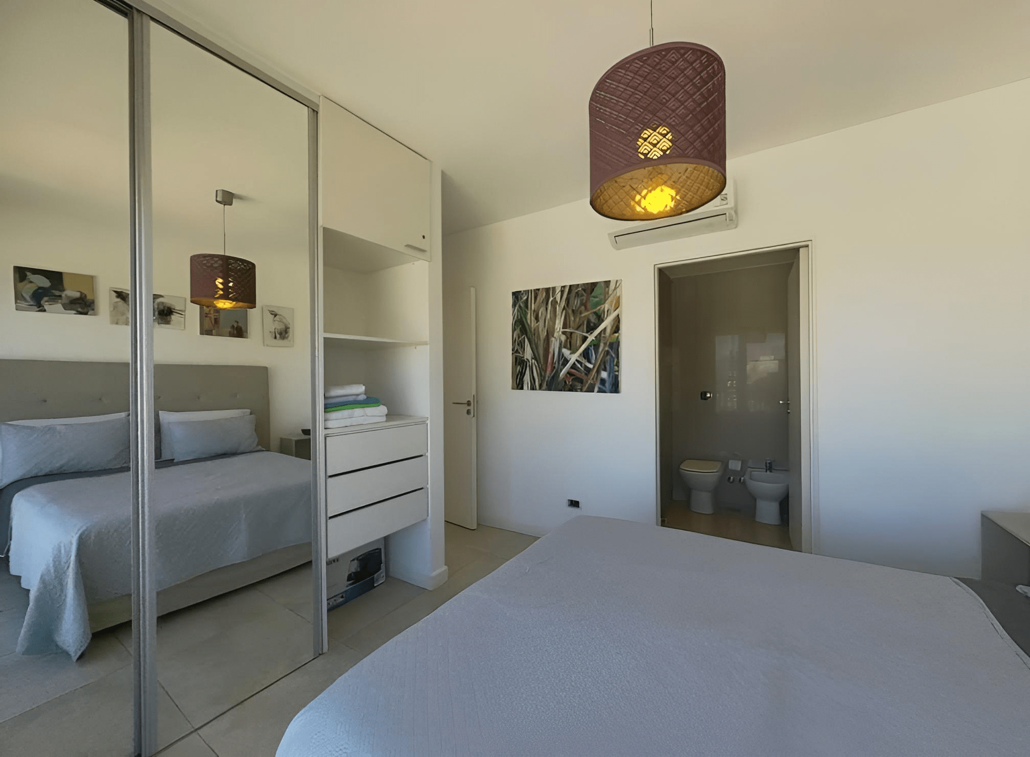 Amplio living comedor con grandes ventanales, mesa, sillas, sillón, TV Smart, mesa de apoyo. Dormitorio en suite con cama Queen, placard de diseño con espacio para guardado de ropa y valijas. Luminaria. Pisos de porcelnato. Pintura en excelente estado. Cortinas black out /sun screen