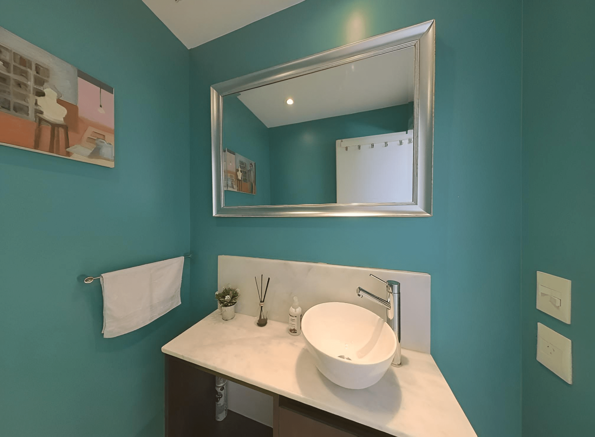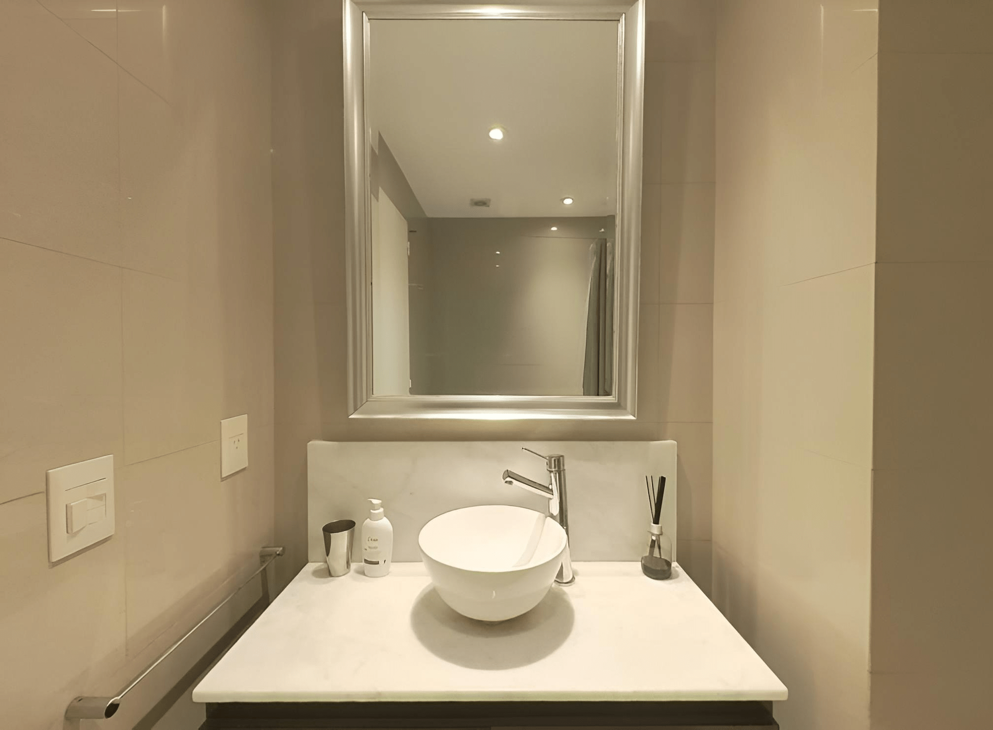 Posee dos baños: de rececpción y principal con espejo, vanitory, sanitarios, bañera, extractor de aire.