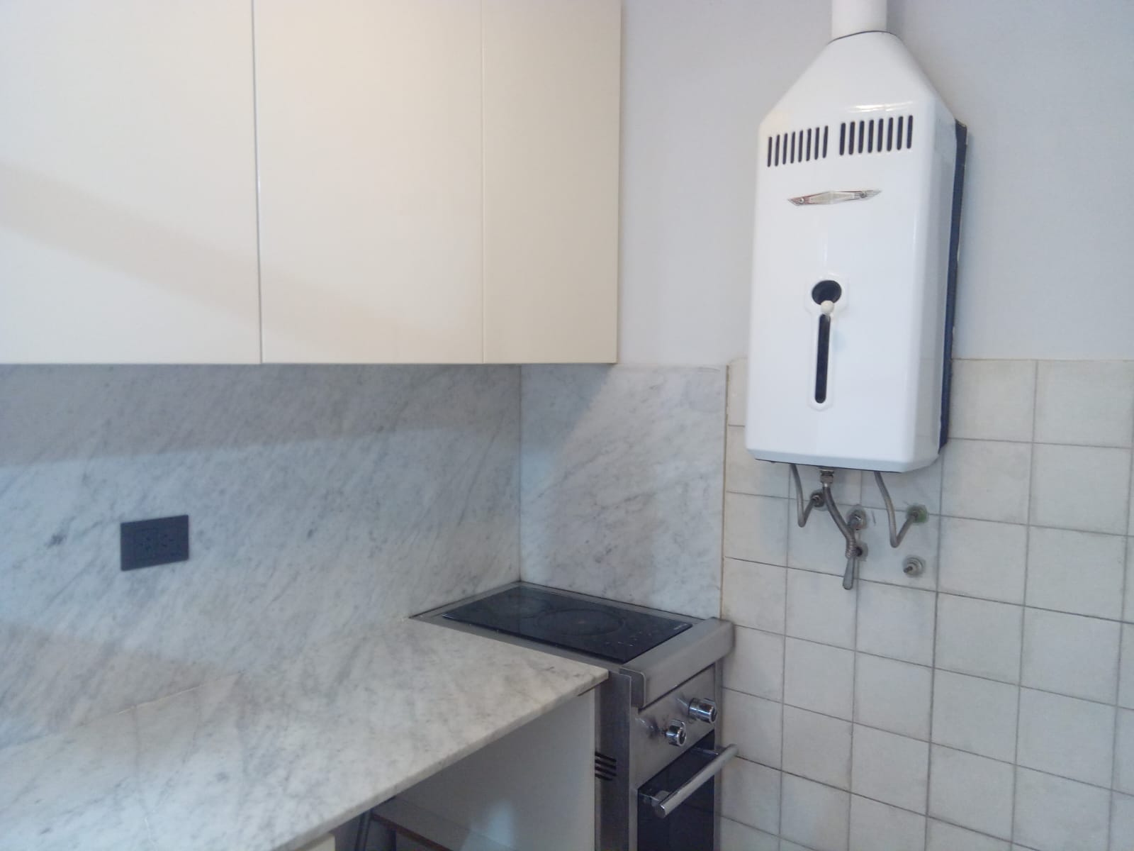 Completa (3.1 m x 4.8 m) con amplio ventanal, vista al patio, mesada de marmold, muebles alto y bajo mesada. Anafe por inducción, horno. Calefón a gas.