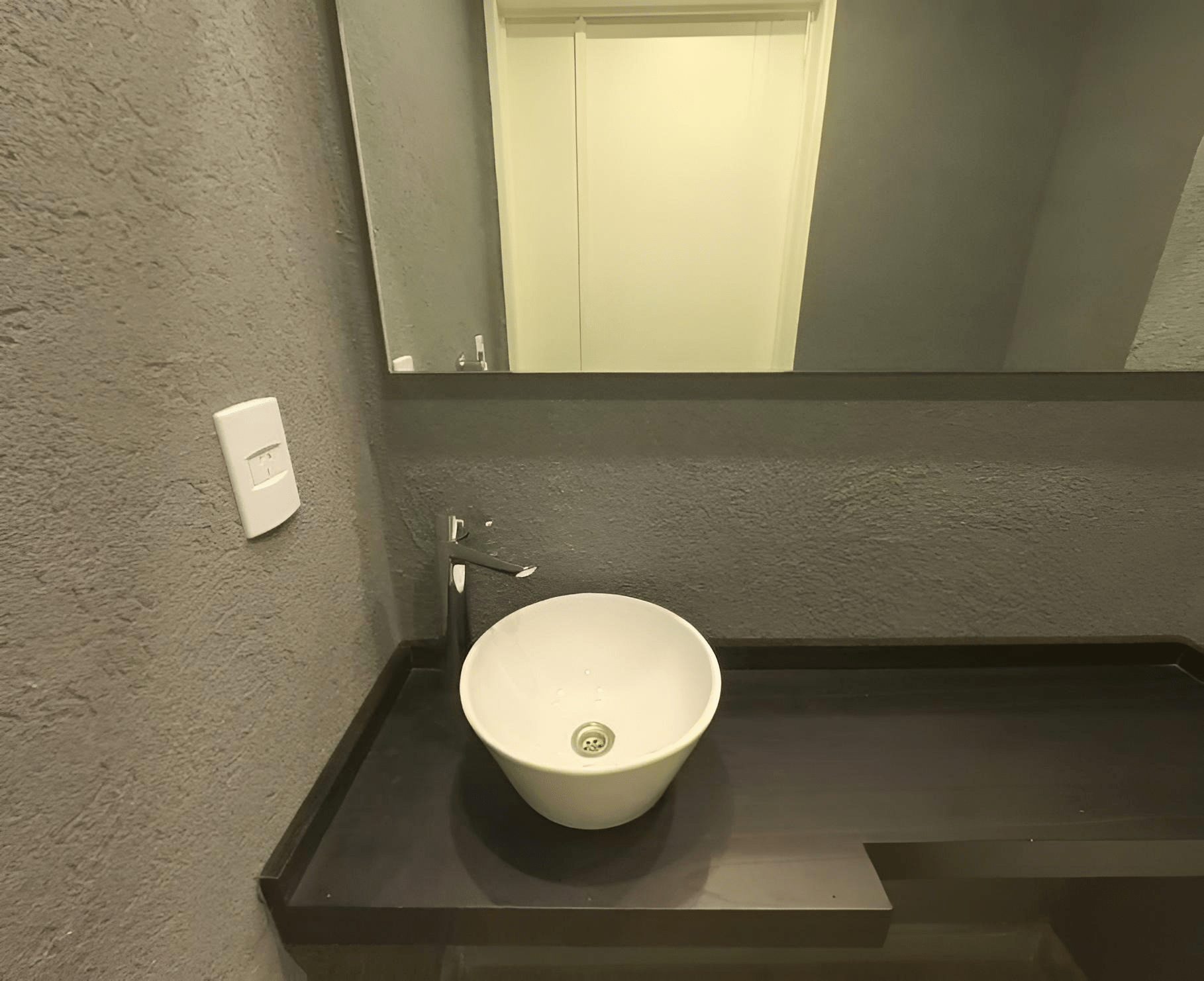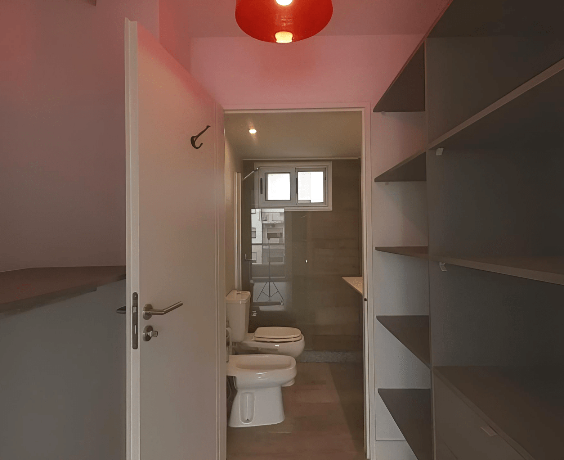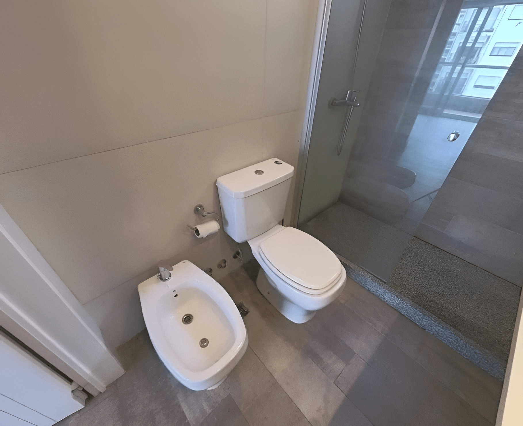 Posee dos baños: de rececpción y principal . El baño de recepción (1m x 2.7m) tiene mesada, amplio espero y sanitario. El baño principal (1.5m x 2.1m) tiene mesada de marmol, bacha, sanitarios completos, espacio ducha con mampara, espejo, Ventana al exterior