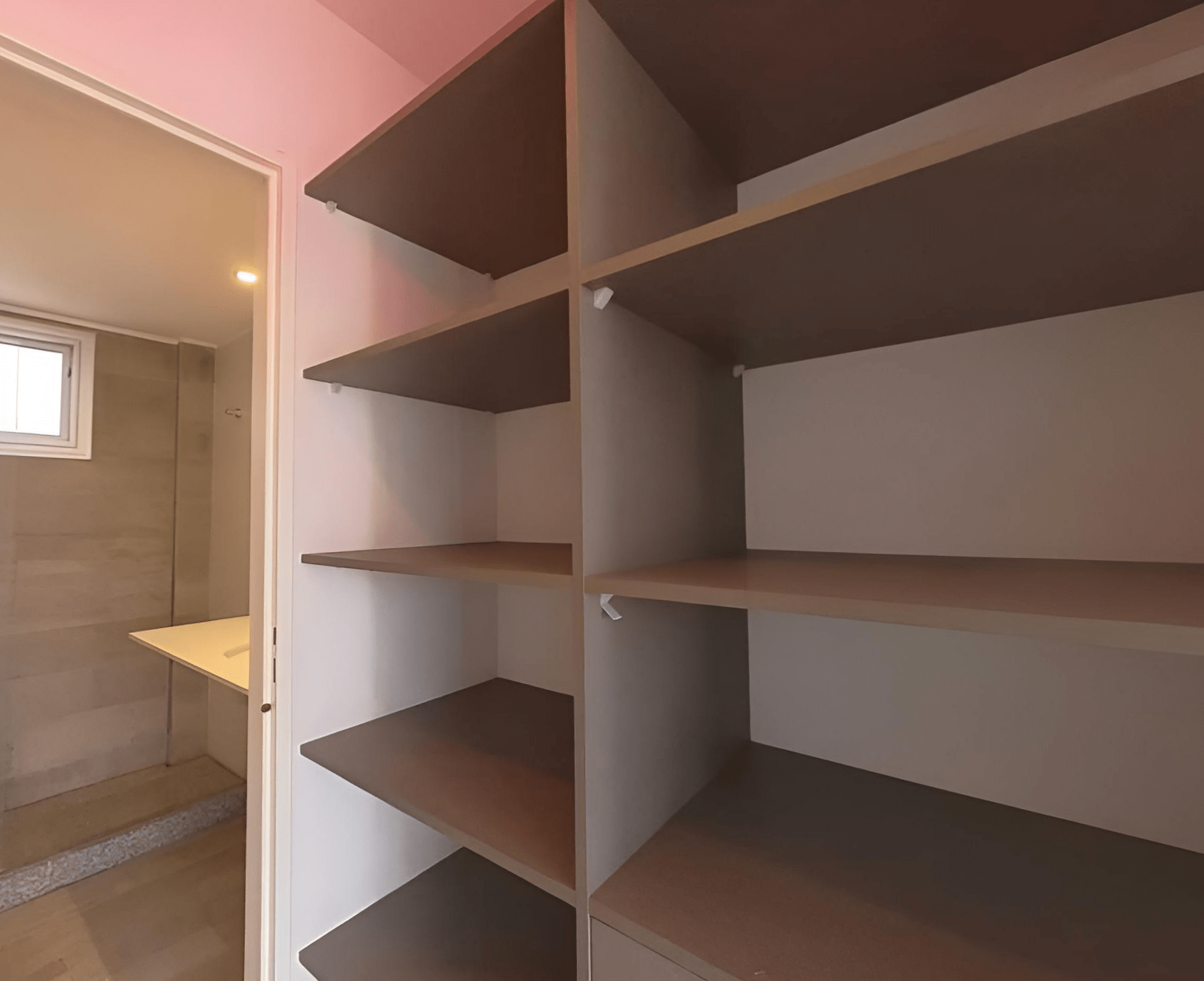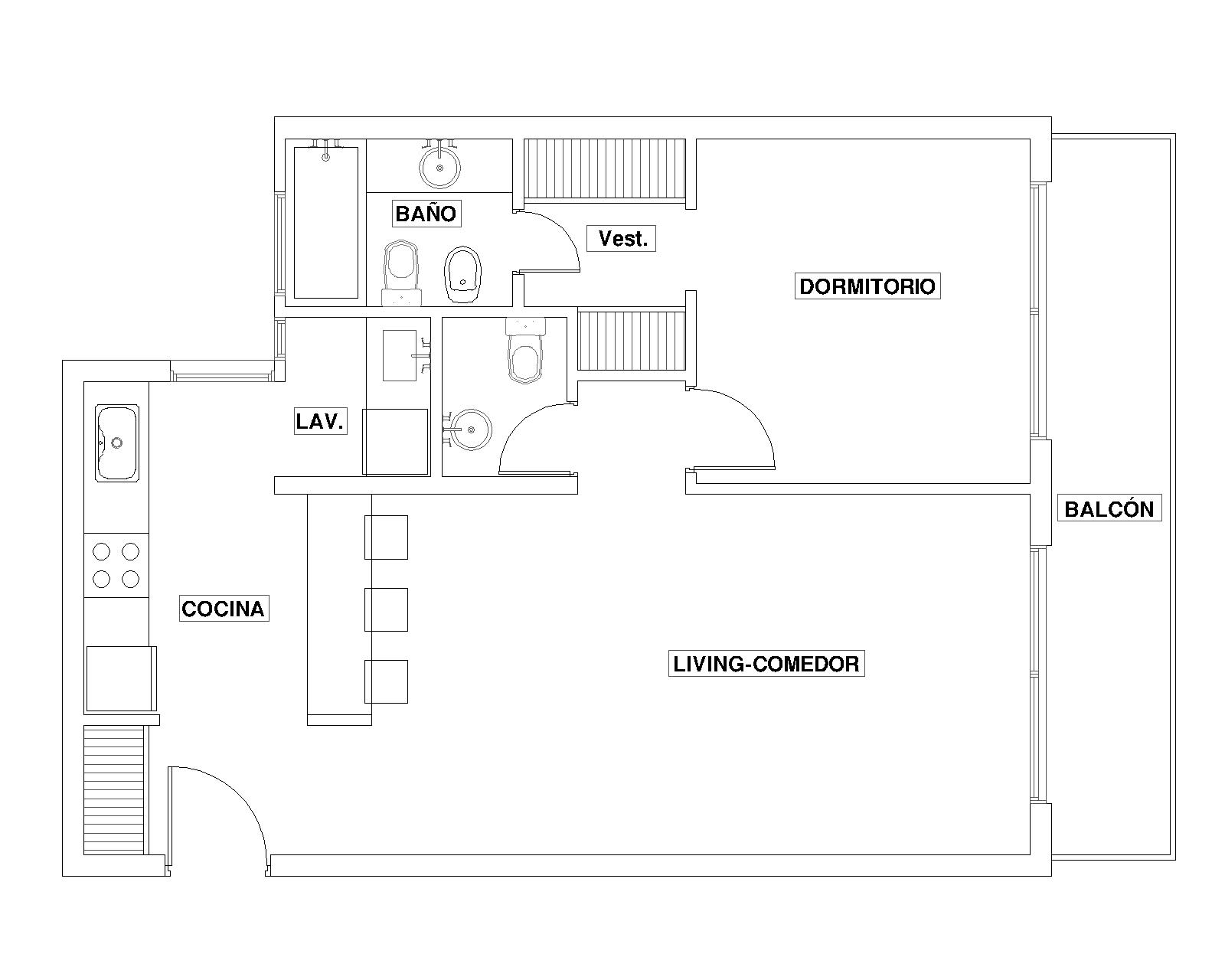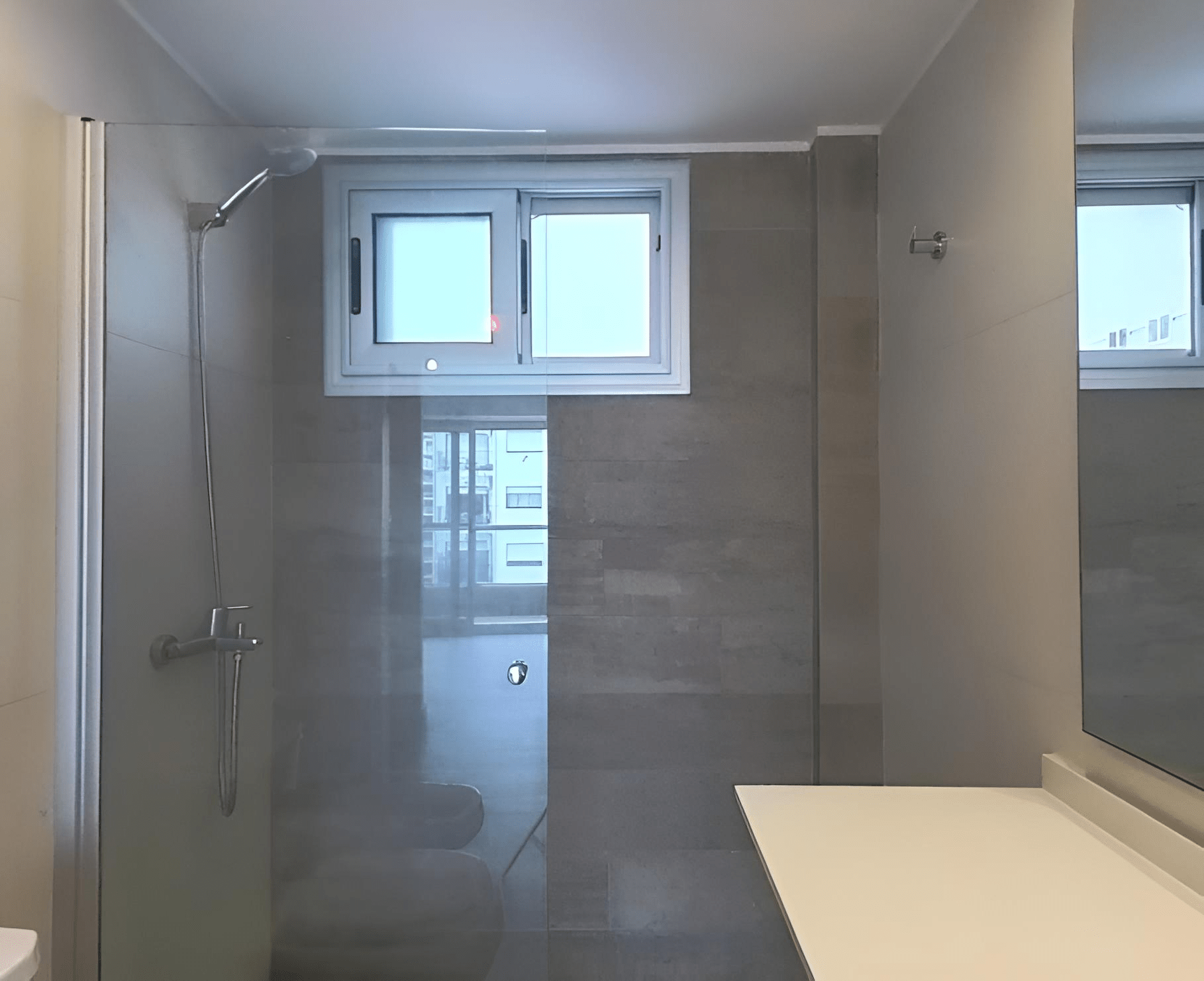 Posee dos baños: de rececpción y principal . El baño de recepción (1m x 2.7m) tiene mesada, amplio espero y sanitario. El baño principal (1.5m x 2.1m) tiene mesada de marmol, bacha, sanitarios completos, espacio ducha con mampara, espejo, Ventana al exterior