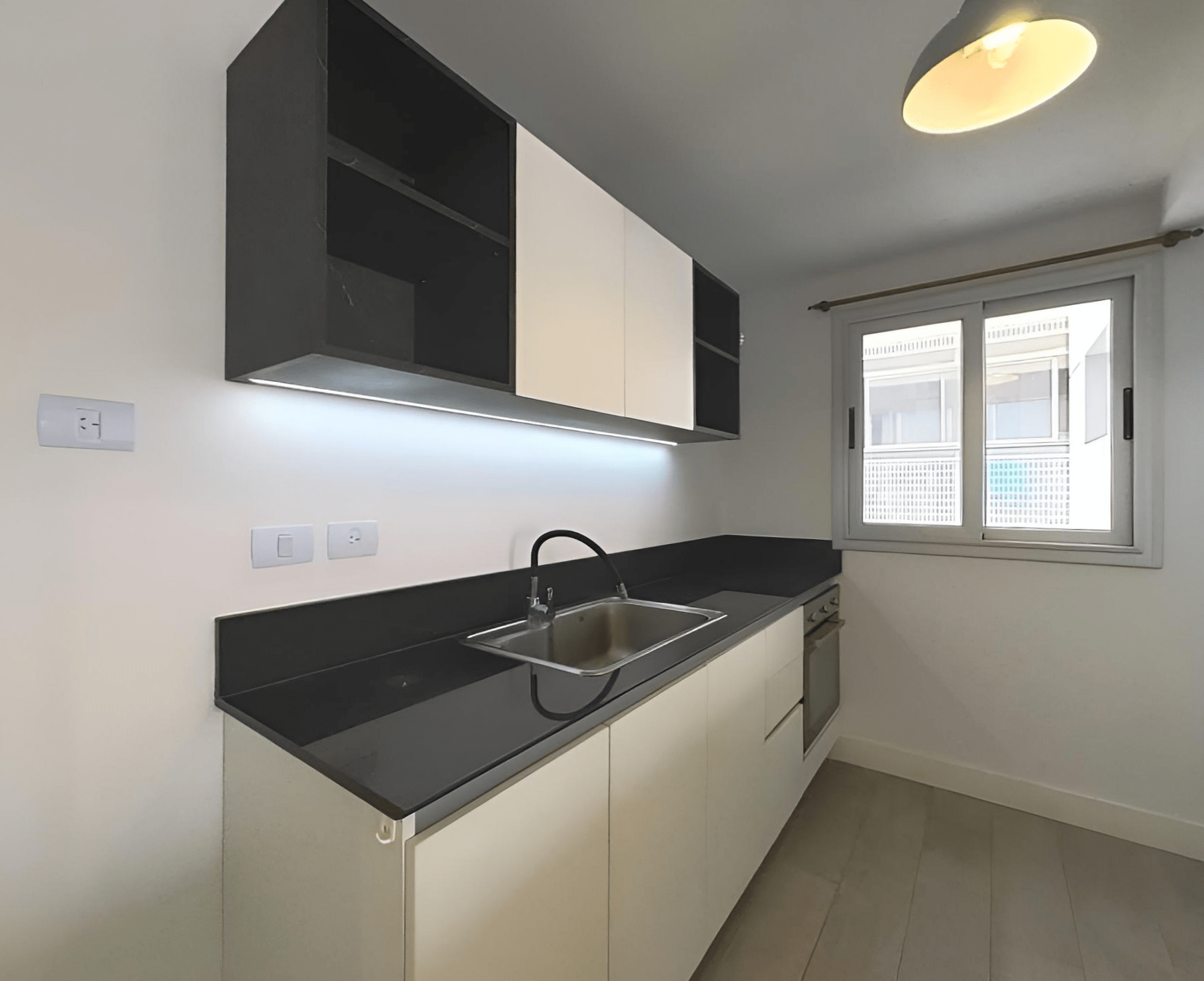 La cocina (2.6 m x 4.4 m) incorporda al living con espacio breakfast con espacio de guardado. Muebles de diseño, amplia mesada, bacha con griferia adaptable, anafé por inducción de 4 hornallas y horno eléctrico, ventana al exterior. Lavadero (1.5m x 4.2m) con mesada, bacha, instalación para lavarropa.s y ventana al exterior.